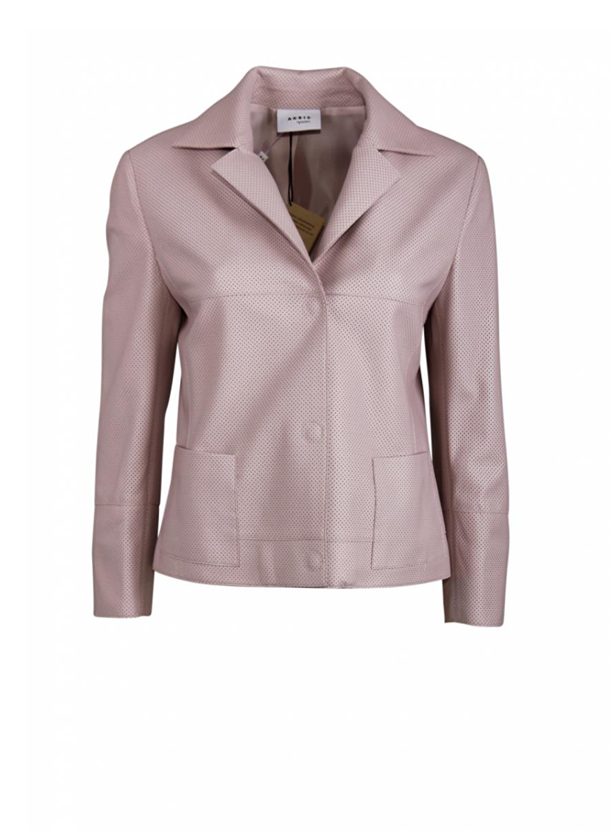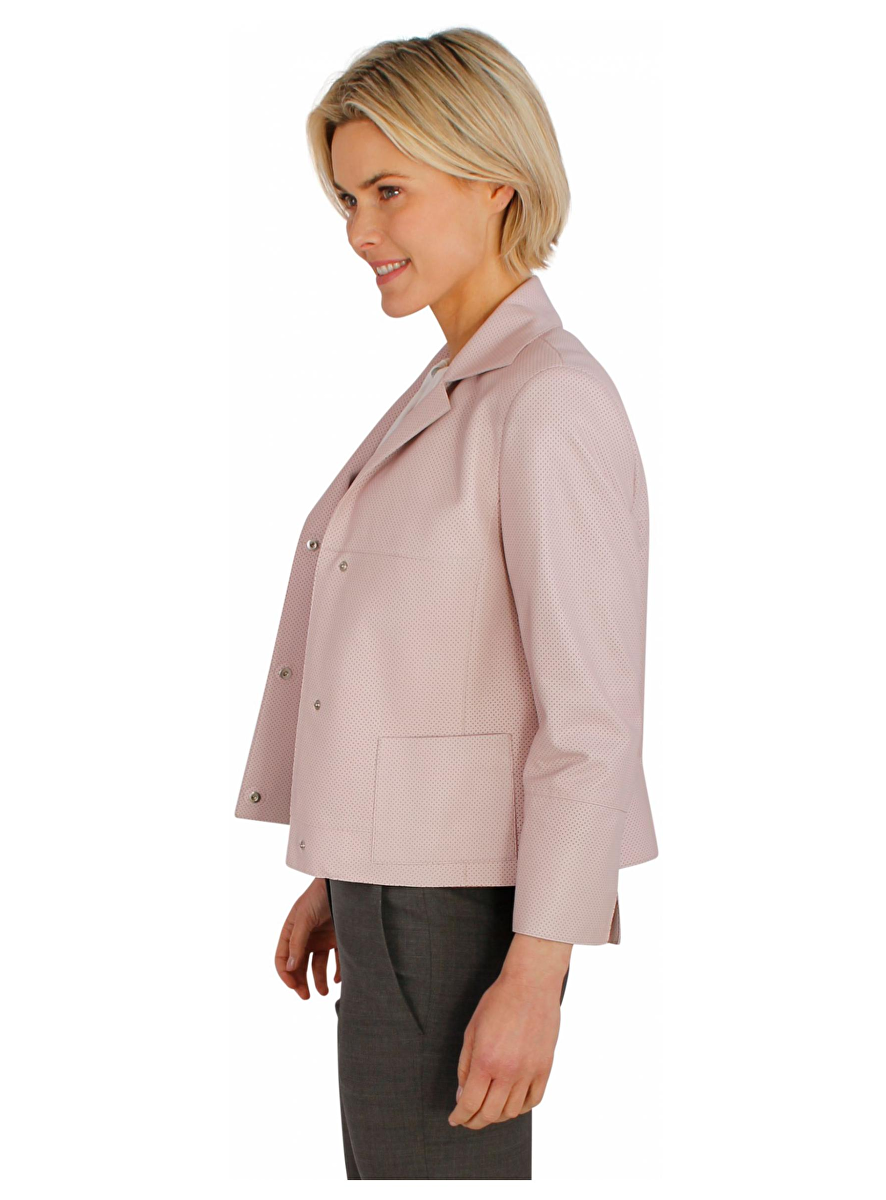 Korte blazer met rever in heel fijn geperforeerd leder. Deze sluit met drukknopen. Twee zakken. Splitjes aan de mouw 7cm. Licht gevoerd.
