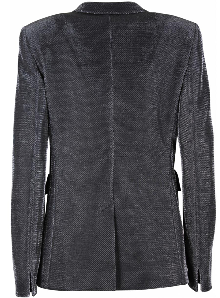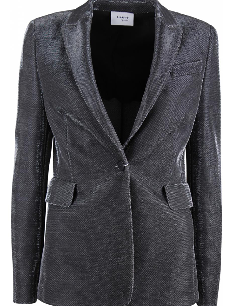 Blazer in metallic zilver met rever. Deze sluit met een knoop heeft twee klepzakken en een blind borstzakje. Split aan de achterkant 20cm. Voering aan de binnenkant schouders.