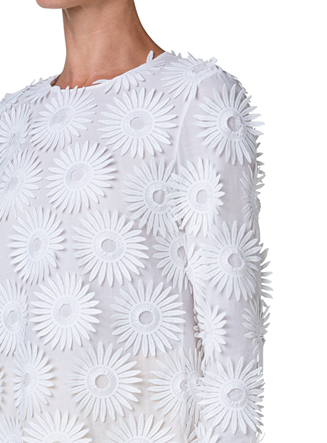 Detail: ronde hals - lange mouw - splitjes zijkant van 10 cm - bloemen erop gestikt - blinde rittsluiting 40 cm.
