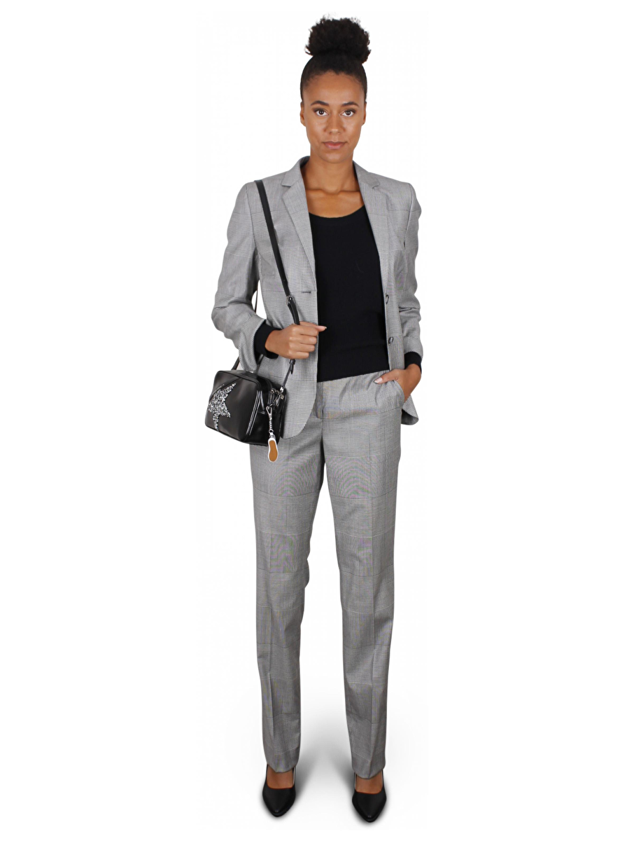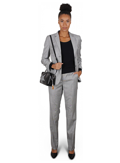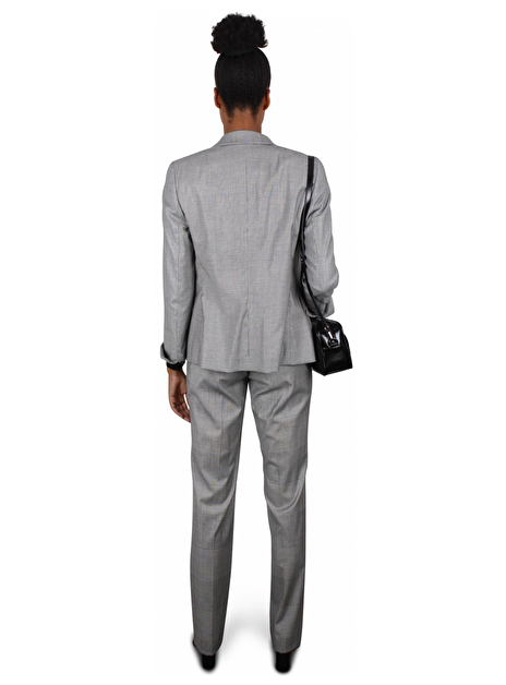 Getailleerd broekpak grijs ruit prince de gallesSluit aan met twee knopen, klepzakken en omslag manchetten met een splitje 6cm. Schouders en mouwen licht gevoerd.
