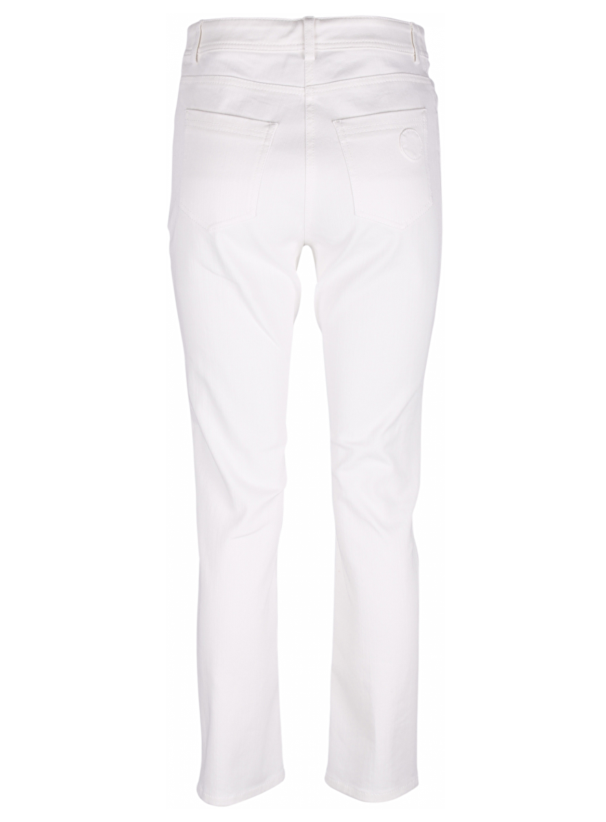 Jeans five pocket met rond cirkeltje aan de achterkant zak. Gladde zilverkleurige knoop. Highwaist.