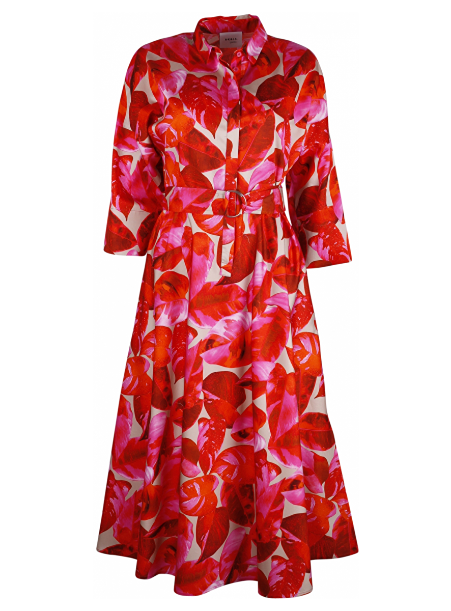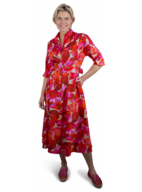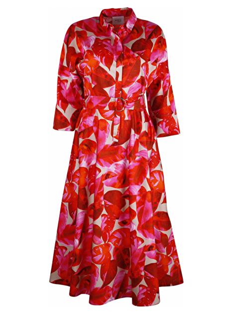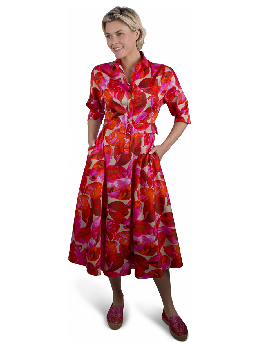 Jurk in tuniek style met blad dessin in rood, roze, beige. Klein kraagje. Blinde tuniek knoopsluiting. Stoffen ceintuur met D gesp in zilverkleurig metaal. Steekzakken. 3/4 mouwen. Splitten 36cm.