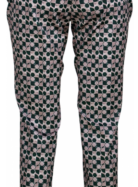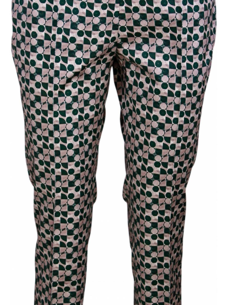 Pantalon in beige groen met cirkels. Deze heeft twee rechte zakken en een ritssluiting aan de linker zij.