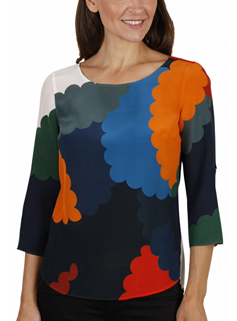 Deze multi kleurige zijden top van A-K-R-I-S punto heeft een ronde hals en een apart grafisch dessin van kleurige wolken. De kleuren zijn fris oranje, blauw en groen. De mouwen zijn driekwart, deze kunnen ook iets omhoog met een knoopje gedragen worden. De top loopt iets gerend uit naar de onderkant en heeft aan de voorkant en achterkant een afgeronde zoom met een split effect aan beide kanten. Aan de achterkant heeft deze een stolpplooi.