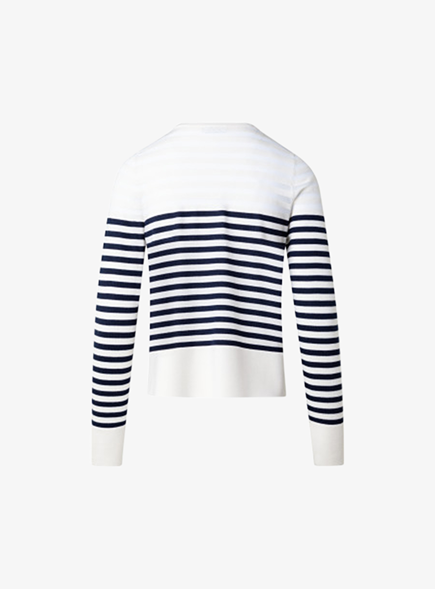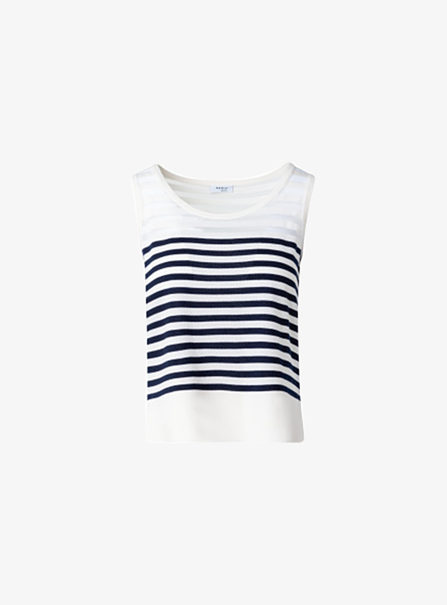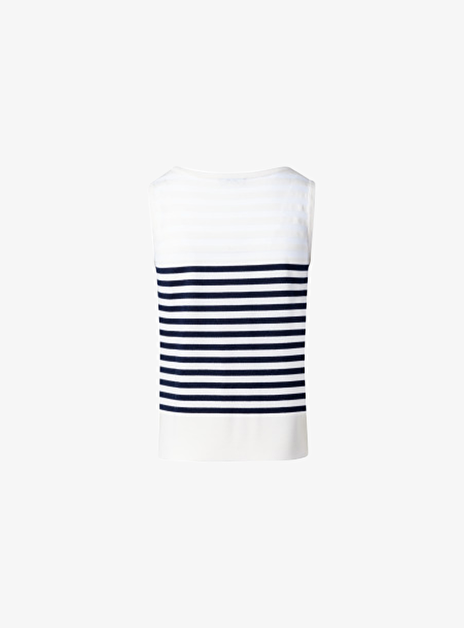Detail: ronde hals - vest en hemdje hebben een semi transparant roomwilt gestreepte bovenkant - onderkant is roomwit blauw gestreept - zijkant splitjes 10 cm.