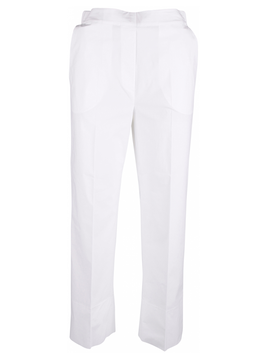 Enkellange pantalon met elastische taille. Steekzakken. Fake paspelzakken aan de achterkant. Breede zoom.