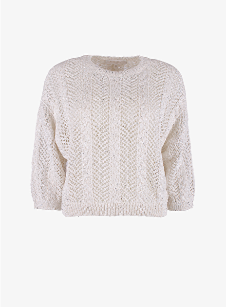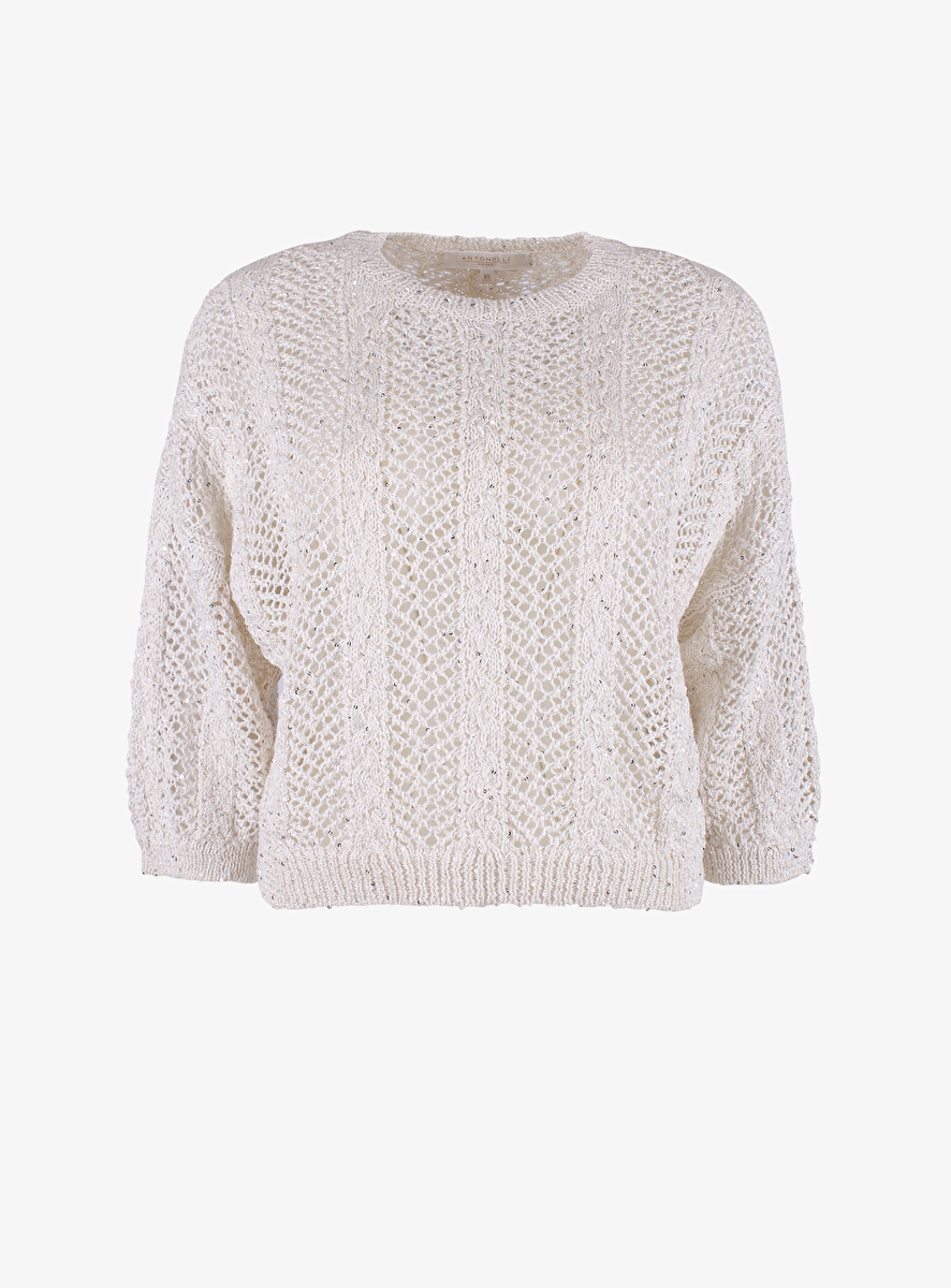 Detail: ronde hals - open gebreid met zilverkleurige mini lovertjes - mouwen tot of over de elleboog.