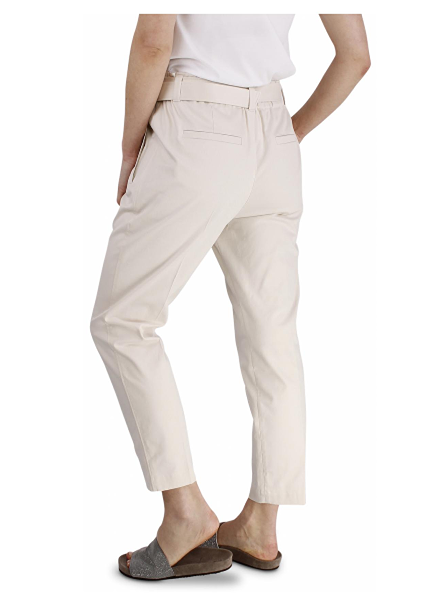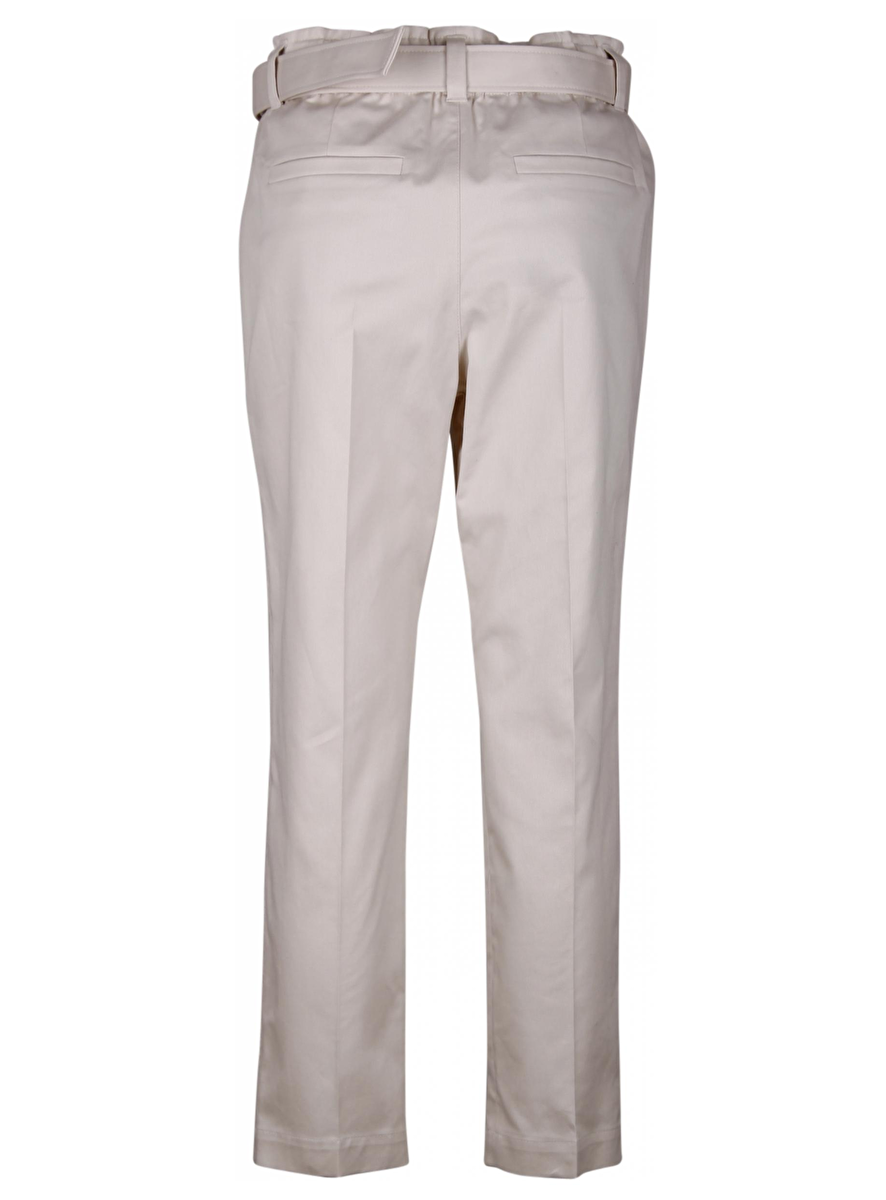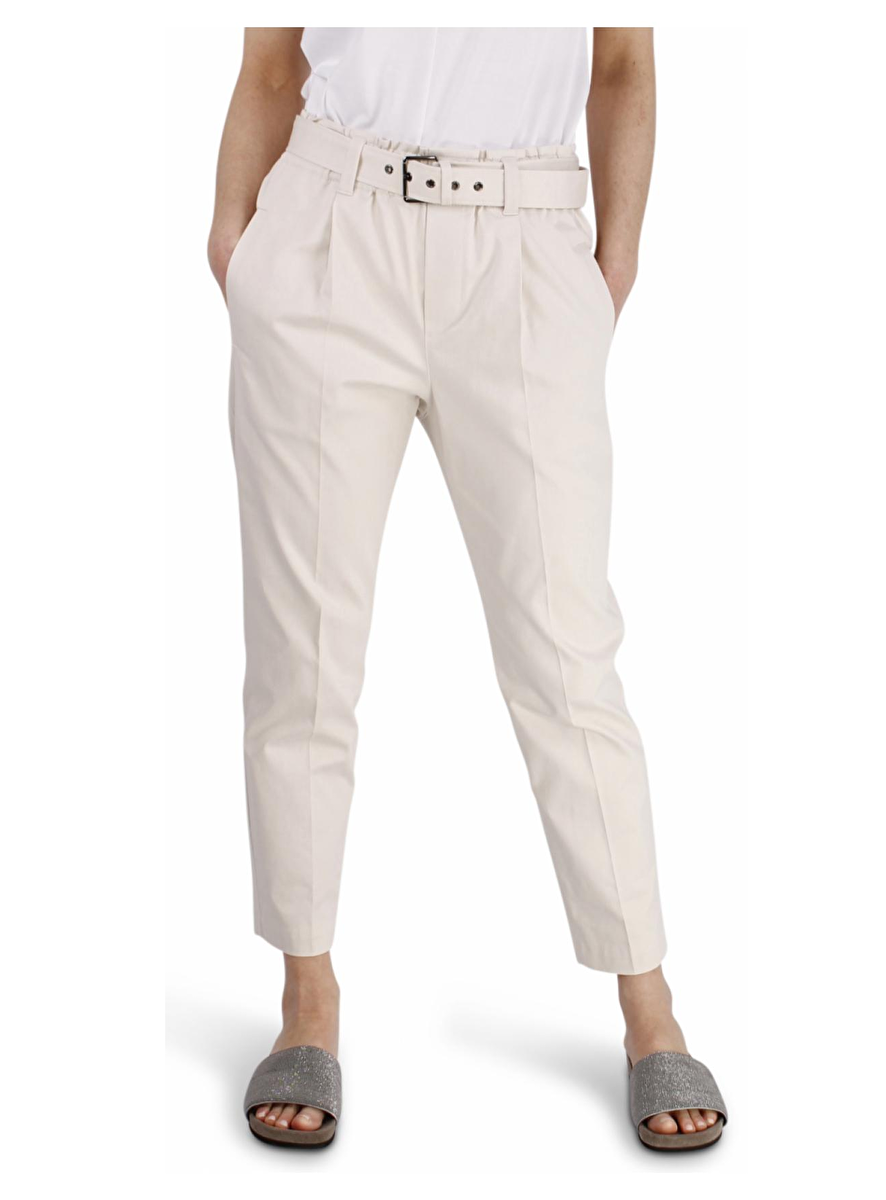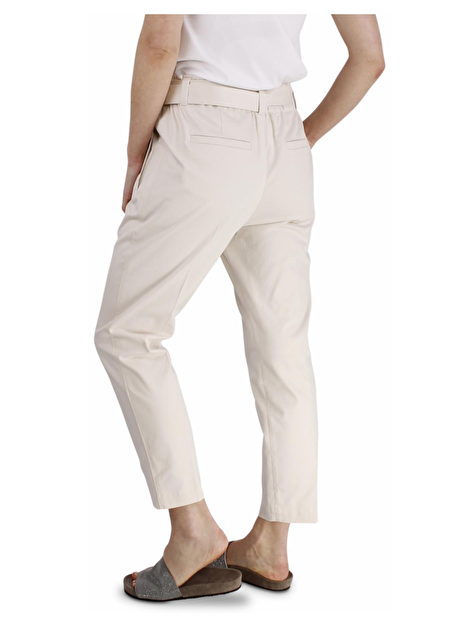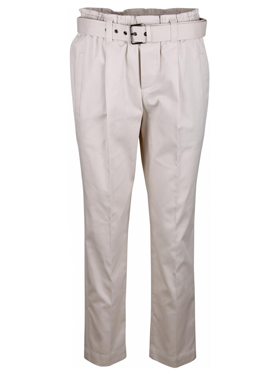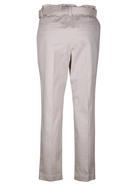 Broek met elastische band en een stoffen ceintuur met smoked zilver. Steekzakken, bandplooi en persvouw. Zakken aan de achterkant.