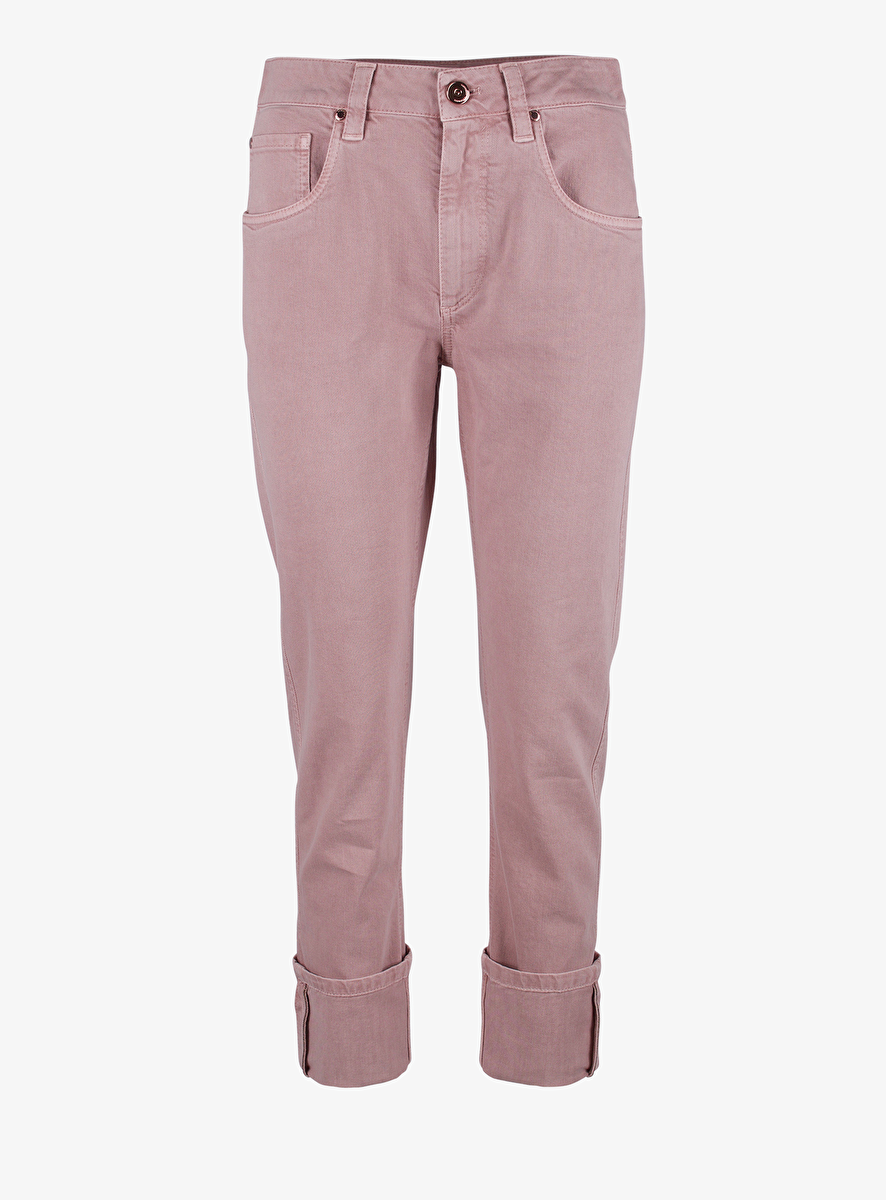 - Detail: 5 pocket jeans met rosé knoop, popnagel en kraaltjes detail - brede omslag 10 cm - leder patch aan de achterkant taille.