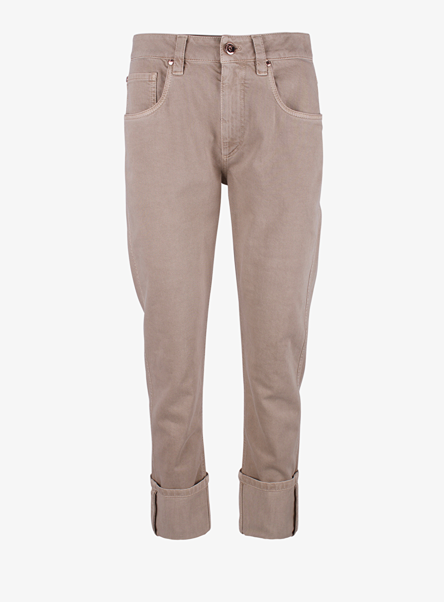 - Detail: 5 pocket jeans met koperkleurige knoop, popnagel en kraaltjes detail - brede omslag 10 cm - leder patch aan de achterkant taille.