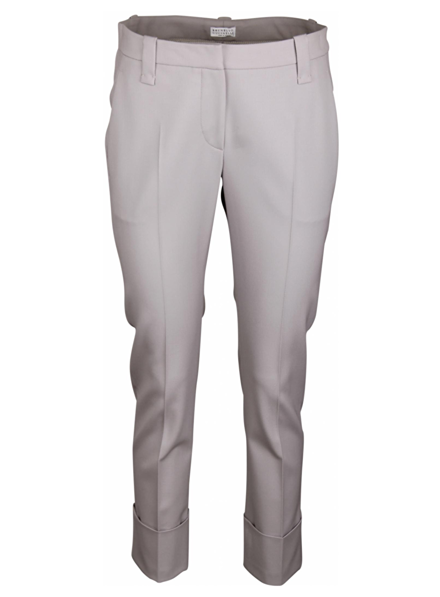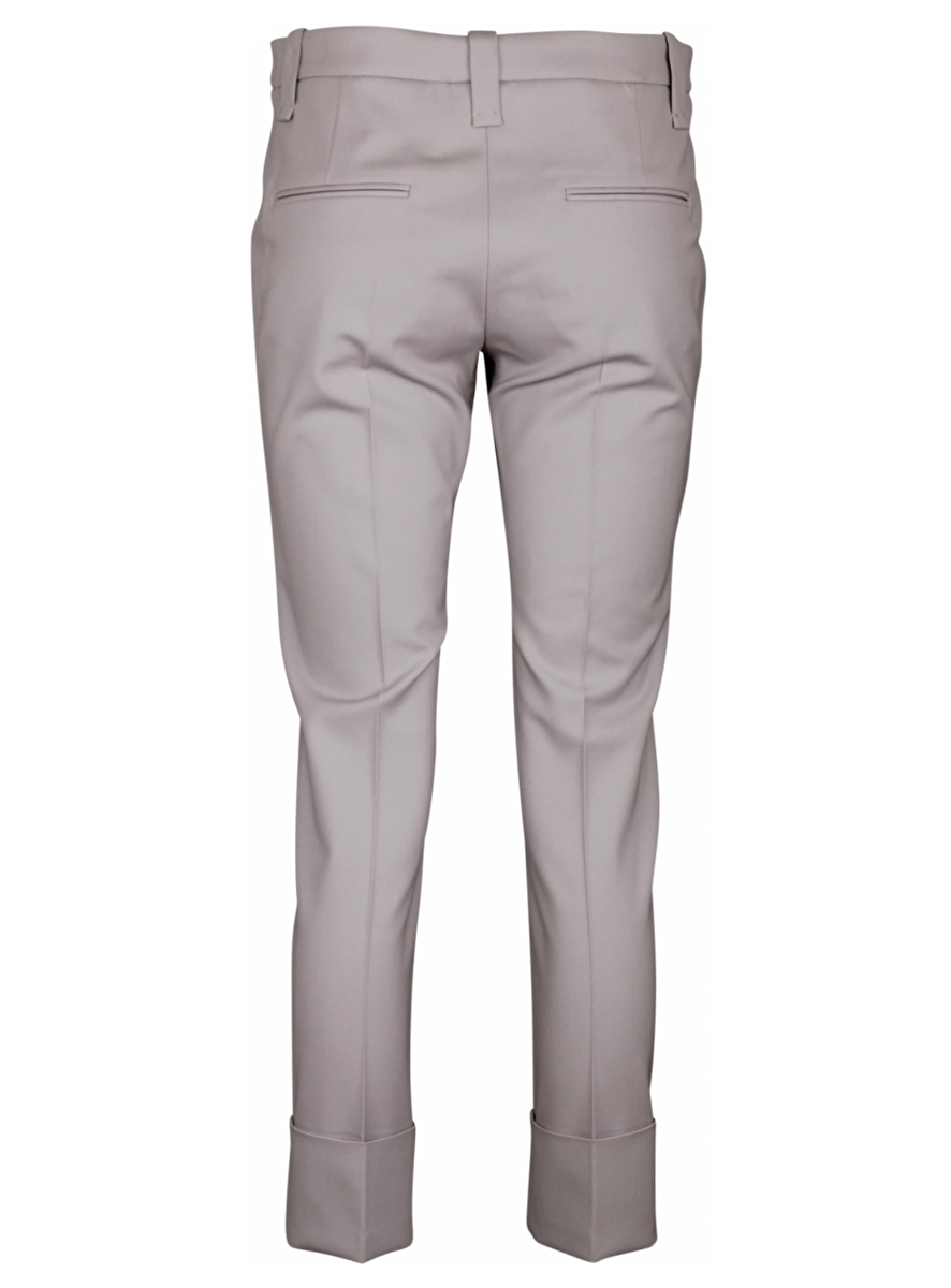 Pantalon kiezelgrijs met een brede omslag van 10cm. Deze loopt taps en valt boven de enkel, heeft steekzakken en aan de achterkant paspel zakken.