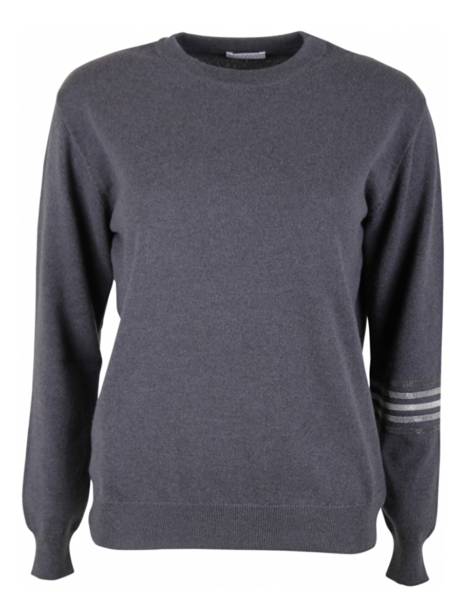 Grijze cashmere pull met ronde hals. Oversized. Smoked en zilver glitter kraaltjes stripes op de linkermouw.
