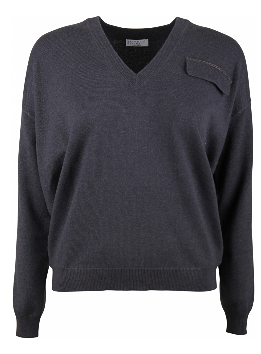 Antraciet cashmere pull met een v-hals. Monoliet smoked zwart kleurige glitter- kraaltjes langs een fake klepzakje.