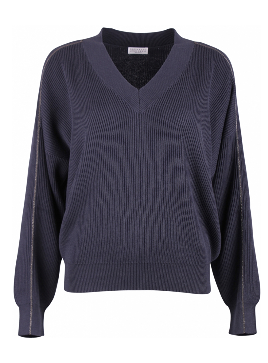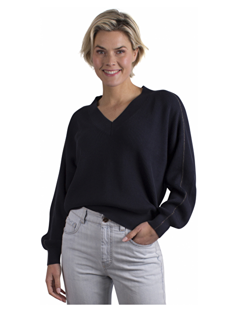 Pull met v-hals en smoked zilverglitter detail over de schouder en mouw.