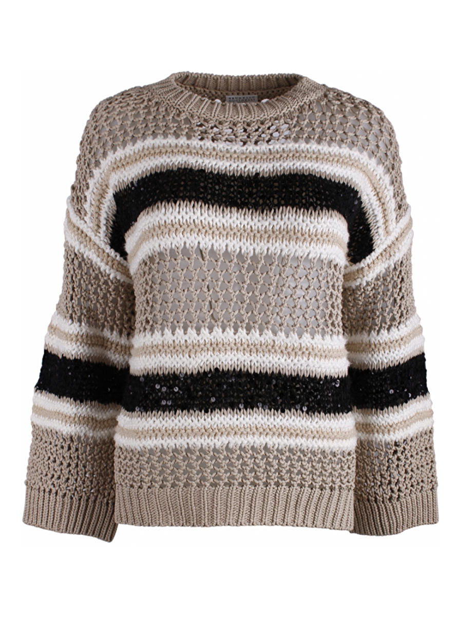 Open grof gebreide pull met ronde hals en gestreept. Zwarte gedeelte heeft zwarte pailleten.