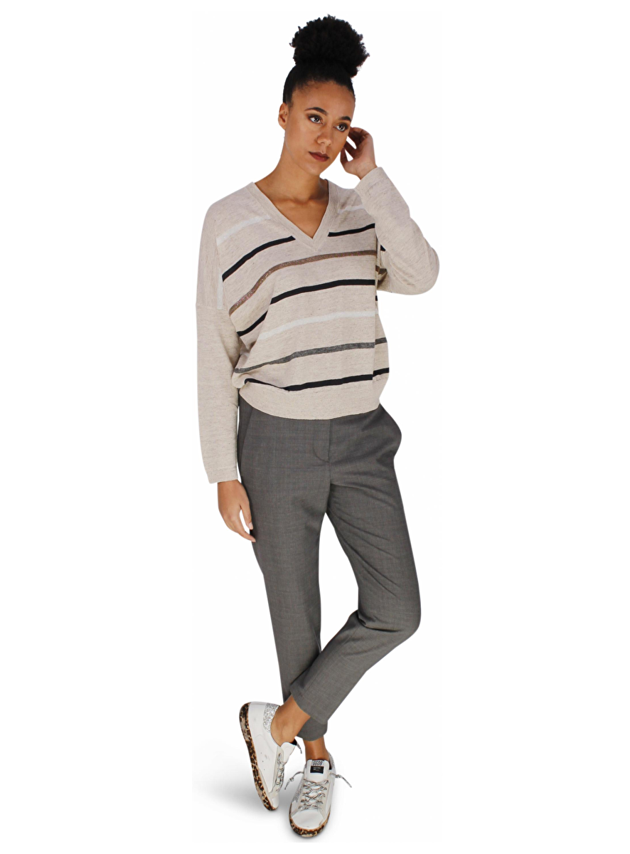 Pull streep v-hals rosé glitter kraaltjes, beige, grijs, wit, zwart