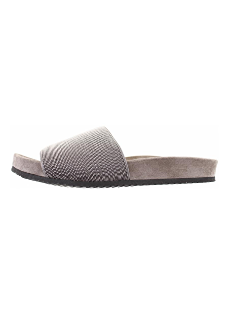 Sandalette met fijne zilver glitterkraaltjes. Deze heeft een suede, relaxt voetbed met een zwarte zool.