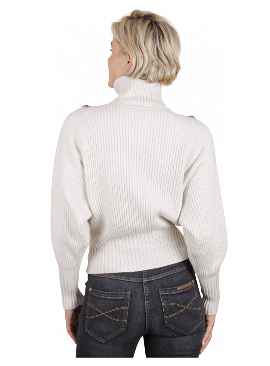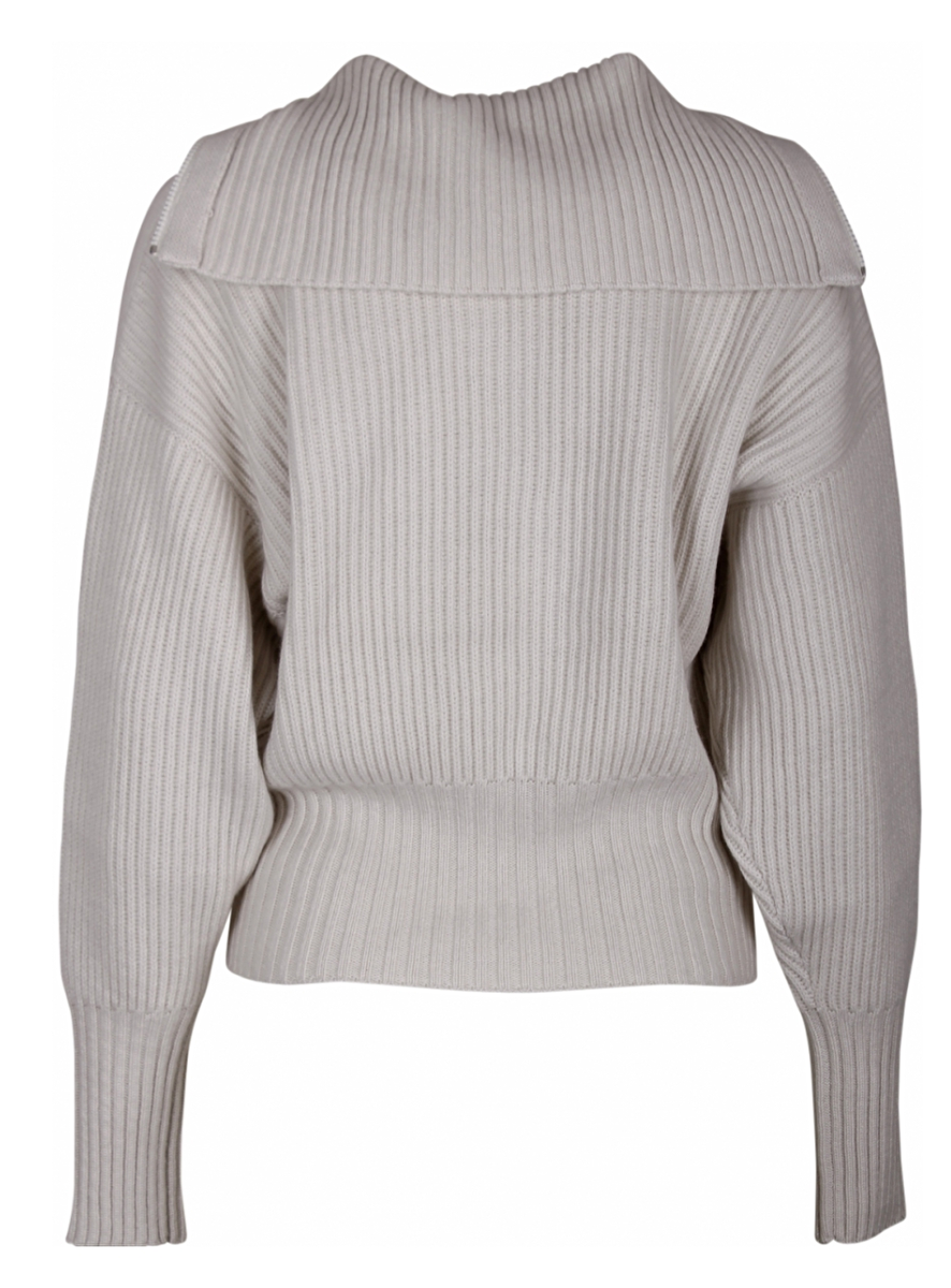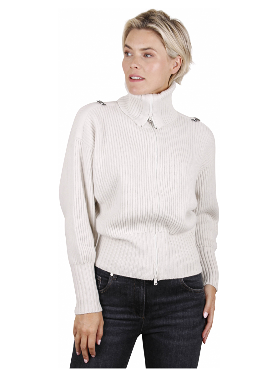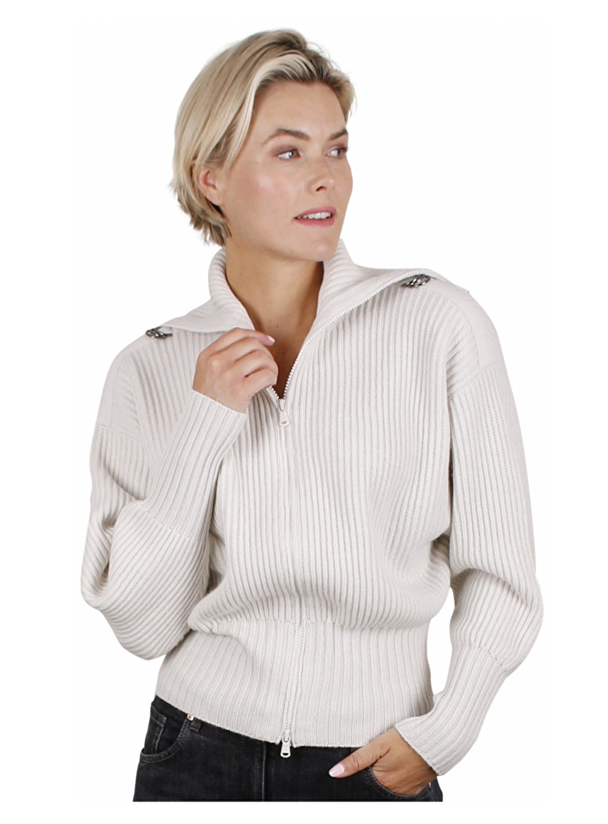 Offwhite kiezel cashmere vest-pull met lange rits tot aan een kol. Drie smoked zilver ringen met structuur op de schouder. Breed boord en manchetten.