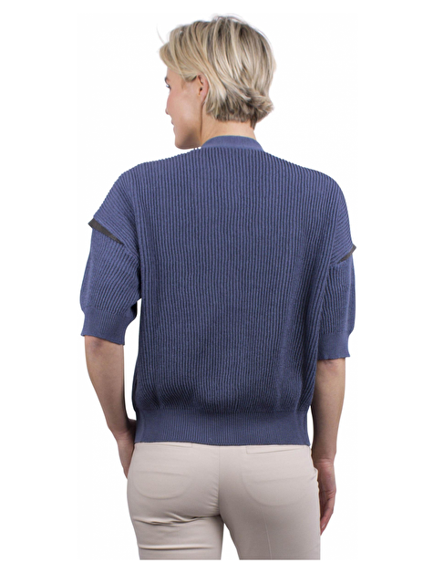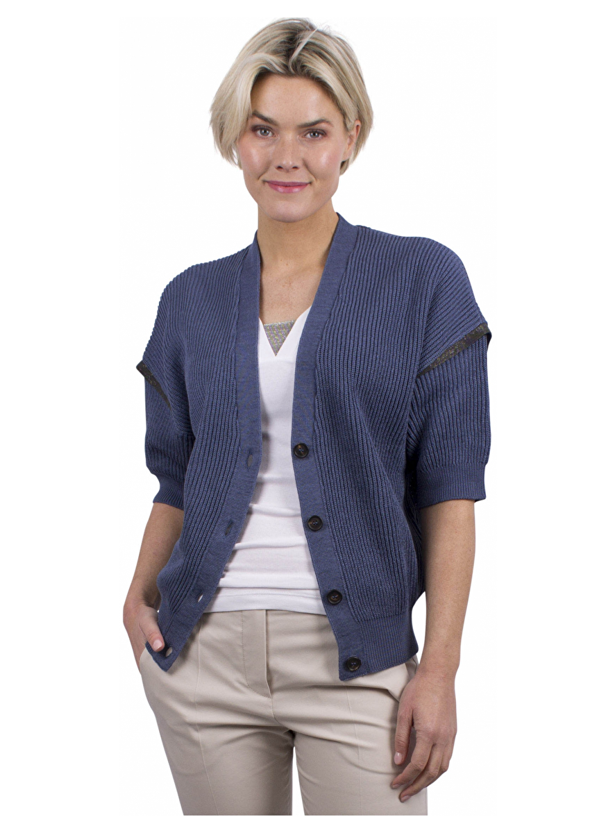 Jeans blauw vest met smoked zilver glitter steentjes op de verlaagde schouders. 3/4 mouw.