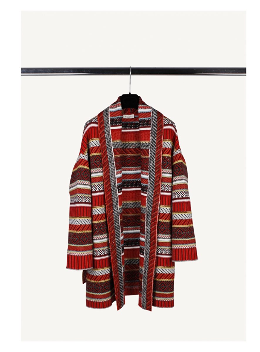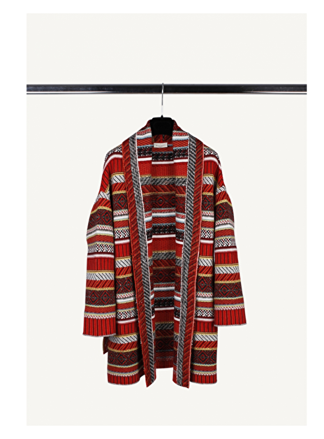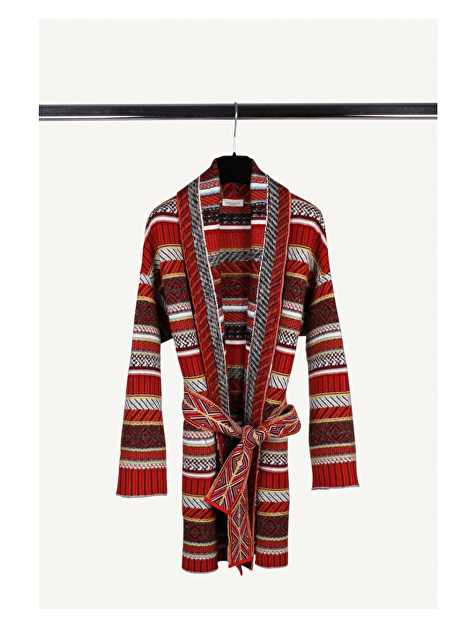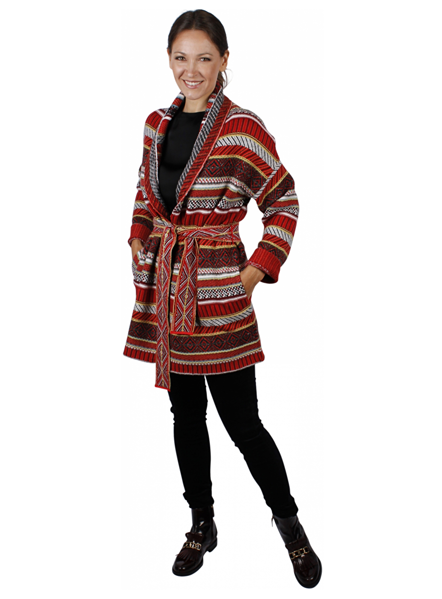 Een prachtig vest in warm rood intarsia (brei techniek waarbij veel patronen en kleuren worden verwerkt) gebreid. De halslijn heeft een sjaalkraag. De kleine kleurige elementen in het vest zijn blauw, beige en oker geel. De taille heeft een ceintuur maar kan ook lekker nonchalant gedragen worden. Topper!