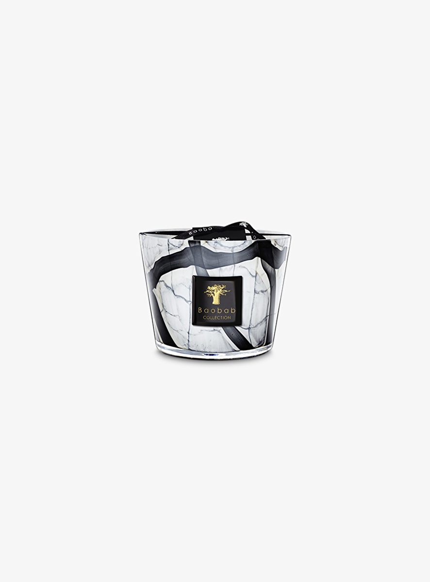 Geurkaars Marble in een mondgeblazen glas. Deze heeft een gemarmerde grijze achtergrond bezaaid met zwarte lijnen omrand met beige. De elegantie van het glas onthult de vlam die het effect geeft van een lichtgevend stenen object.