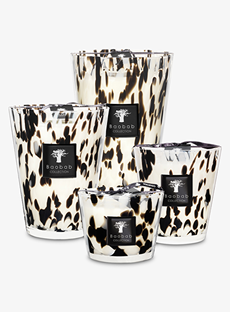 Geurkaars Black Pearls in een mondgeblazen glas. Deze is bezaaid met zwart, geinspireerd door kostbare zwarte parels.