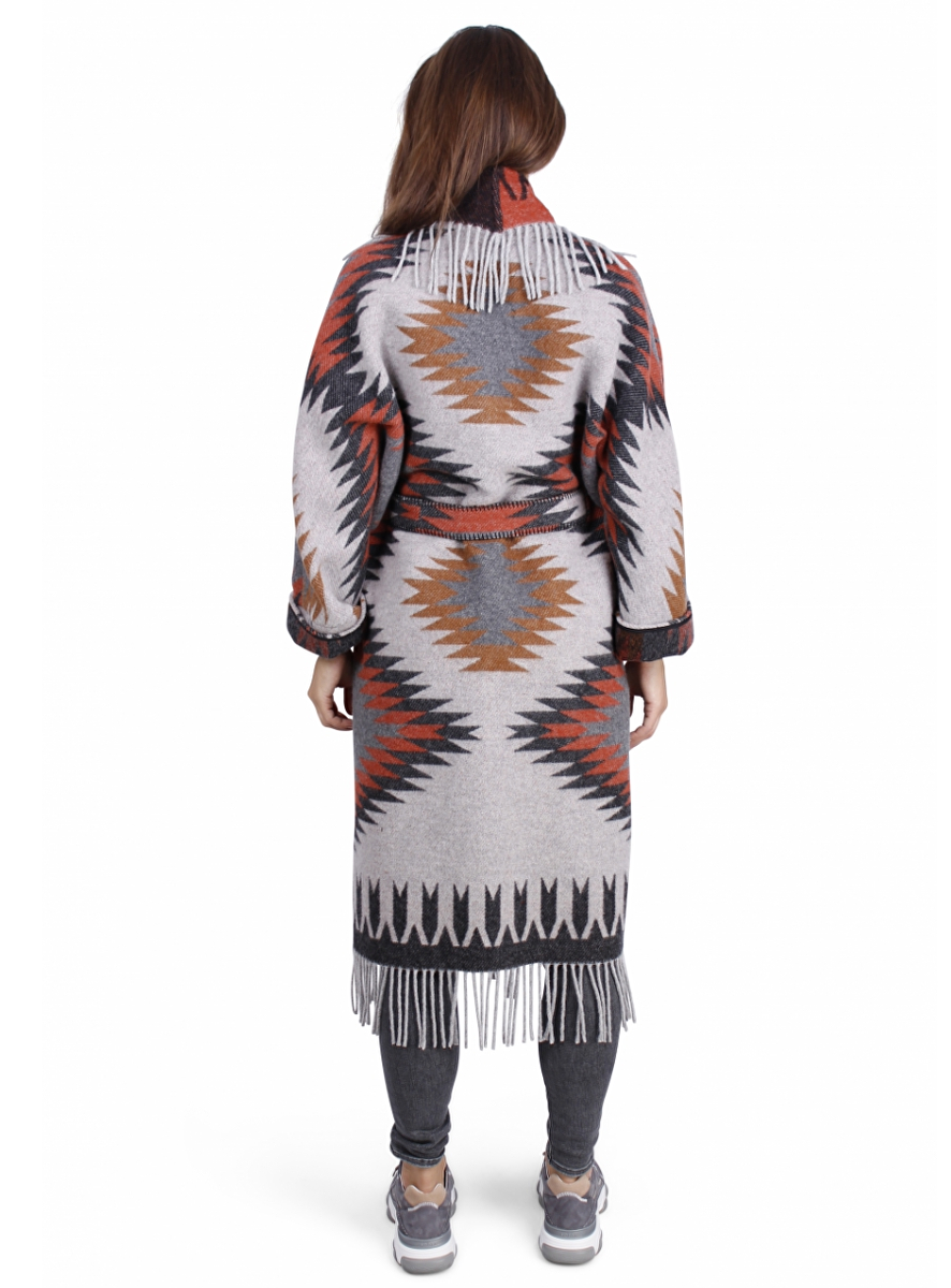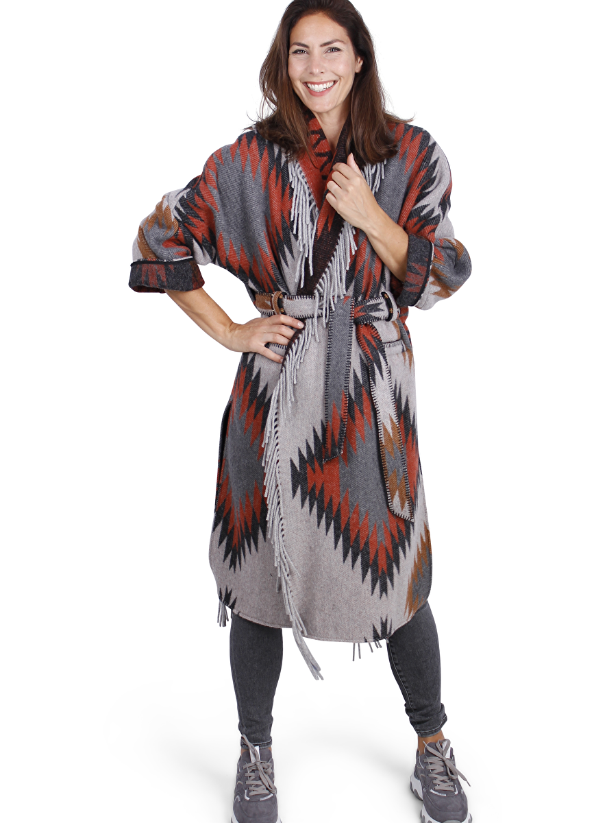 Lange wollen jas met ceintuur en franjes langs kraag. Aztec dessin - Zakken - Splitten.