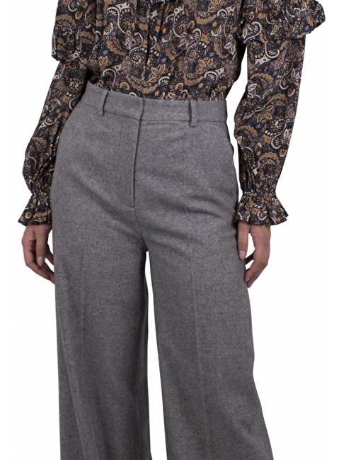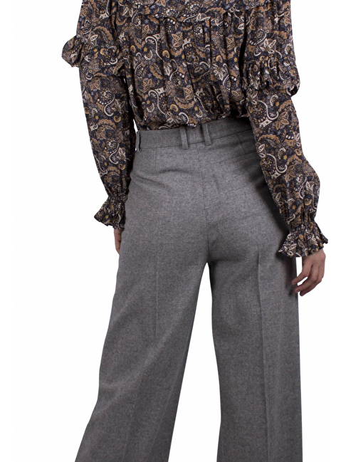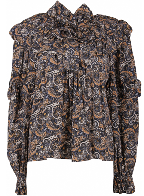Beige, blauwe blouse met dessin. Volants voorkant, kraag. Strik. Pofmouwen. Elastische roezelrand. Knoop en lus aan de achterkant. Gaat over het hoofd aan.