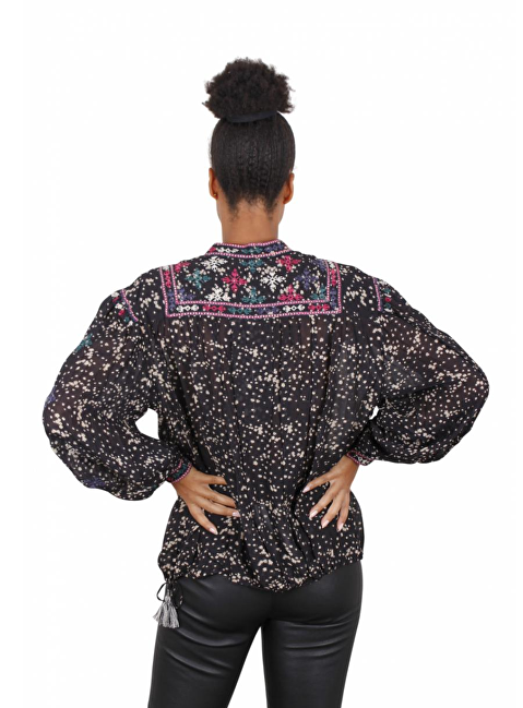 Blouse tuniek zwart beige dessin. Deze is afgewerkt met borduur in groen, blauw, framboos op hals, voorkant en manchetten. Aantrek koord onderkant zoom.
