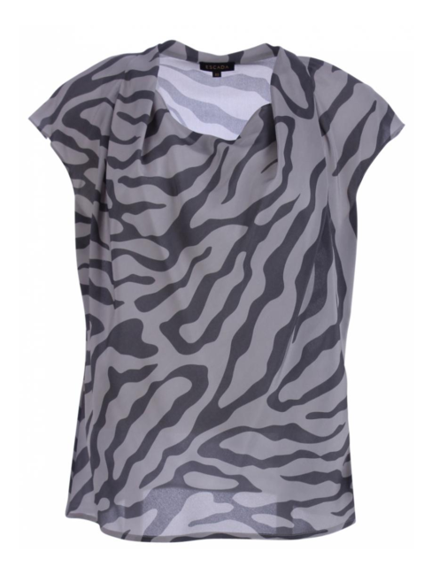 Zijde top uitgevoerd in grijs en lichtgrijs dessin en watervalhals. De top heeft een klein kapmouwtje en heeft een losvallend model. Materiaal bestaat uit 100% zijde.