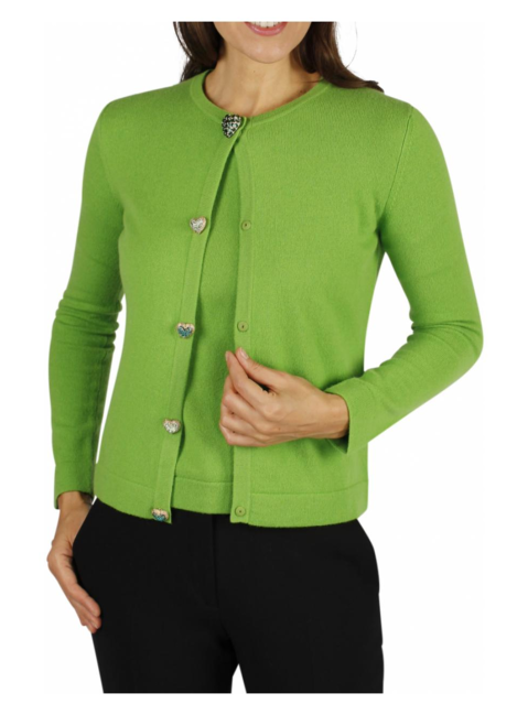 Wat een fris ogende kleur dit appeltjesgroene twinset! De trui met korte mouwen heeft een ronde hals evenals het vest. De hartvormige blinde knopen hebben allemaal een andere groene kleur aan steentjes en de bovenste knoop is groter dan alle andere en schitterd smaragd groen. Mooie set van Escada!