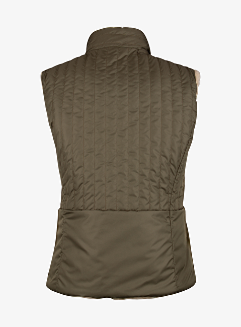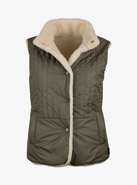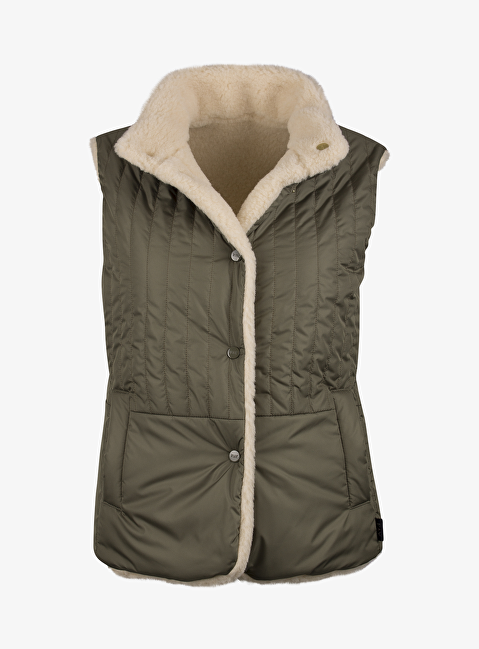 Detail: opstaande kraag - goudkleurige & groene drukknopen - steekzakken - zakken met een rits - verticaal gestept.