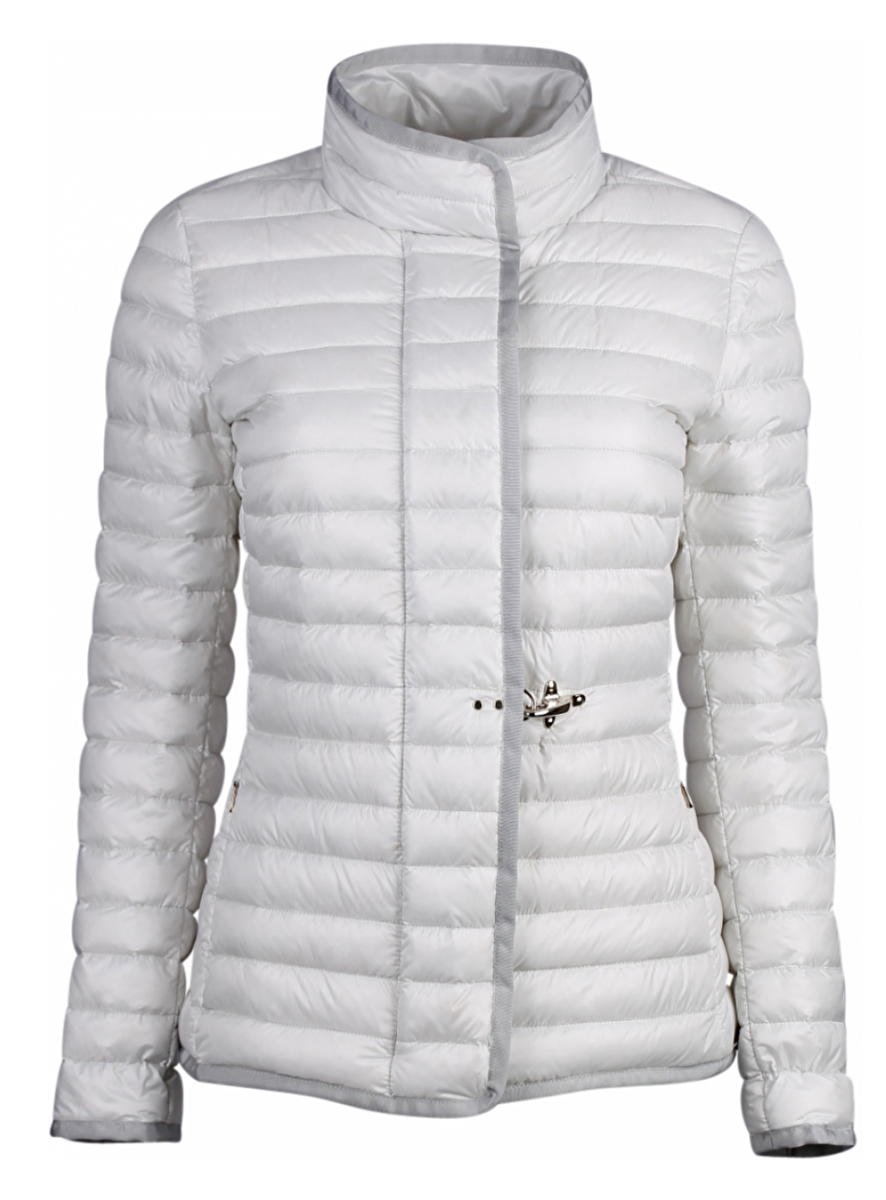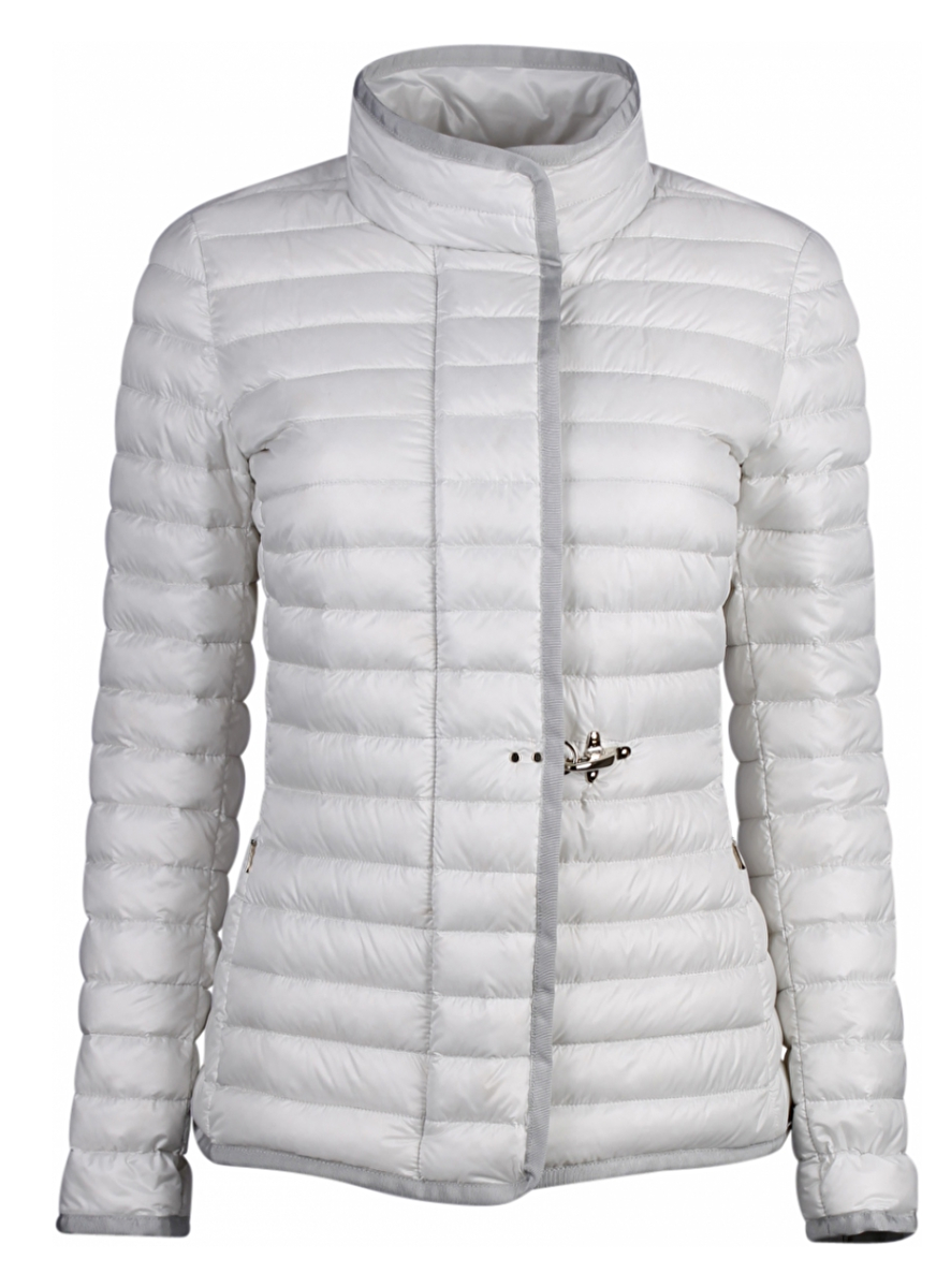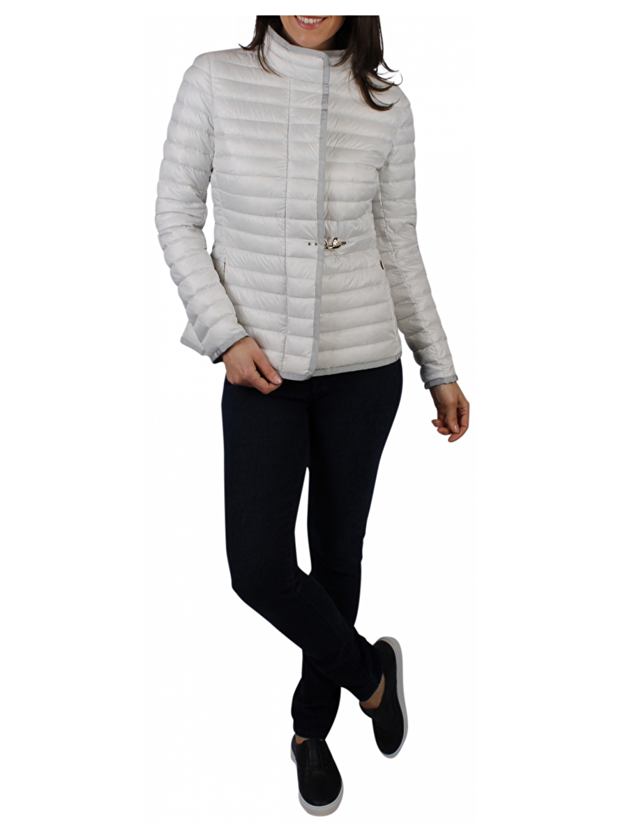 Heel leuk zomerjack van Fay. De kleur is heel licht bijna parelgrijs. Afgebiesd met gross grain bies in dezelfde tint. De haaksluiting is goudkleurig. Het jack heeft een rits en 2 zakken.