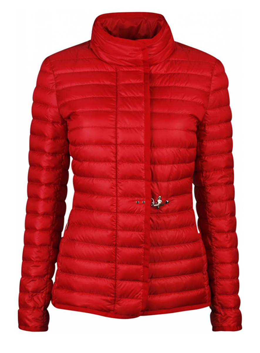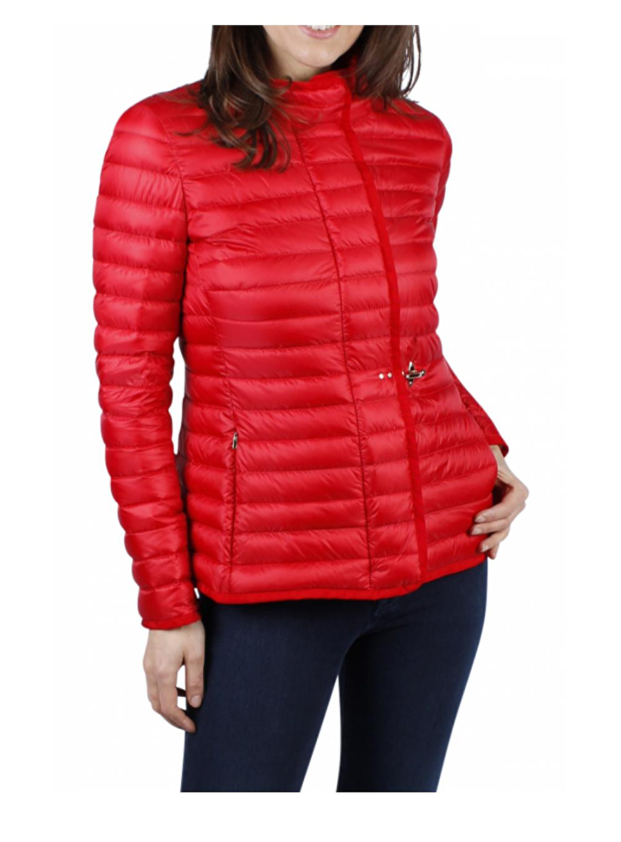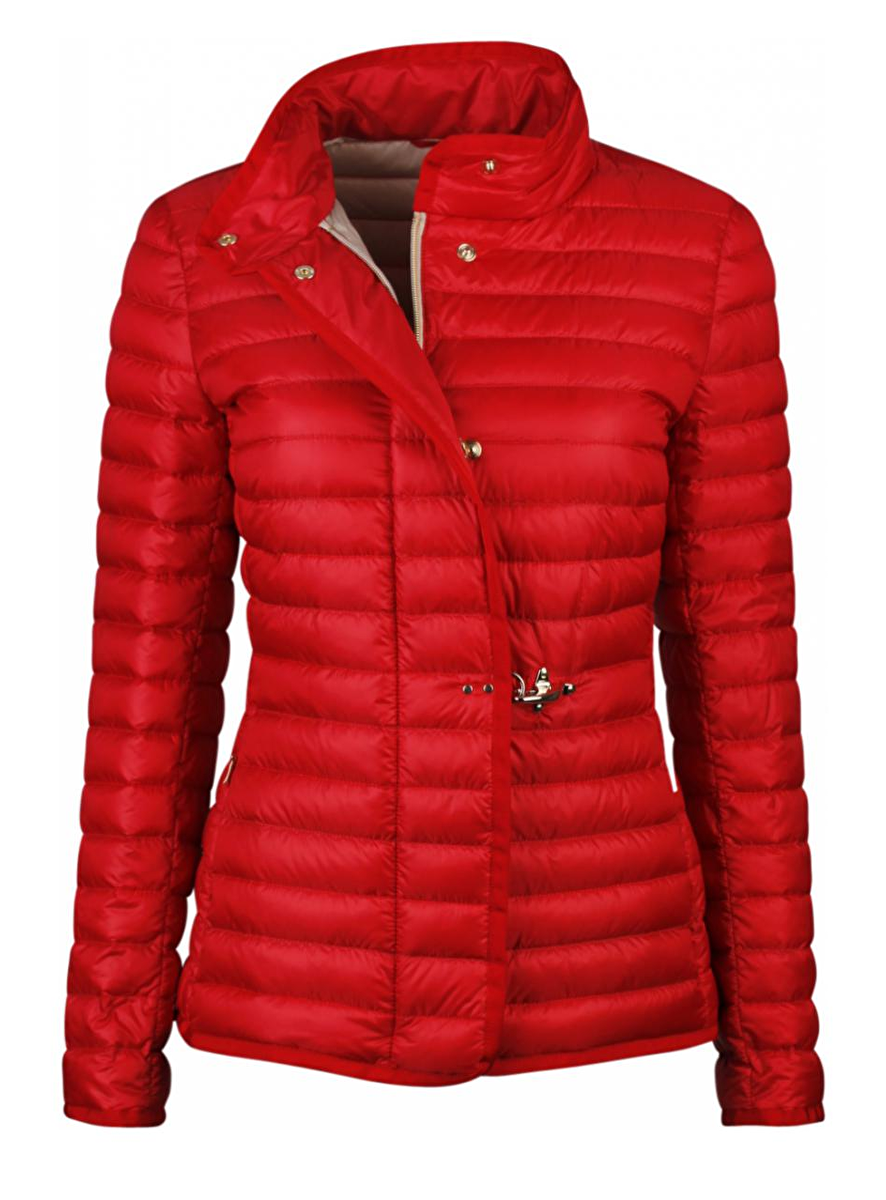 Leuk rood gestept jack van Fay en een opstaand boord. De ritssluiting kan aan twee kanten open en is afgebiesd met grosgrain in rood en sluit aan met vier drukknopen een gouden sierhaak in de taille. De jas heeft twee zakken.