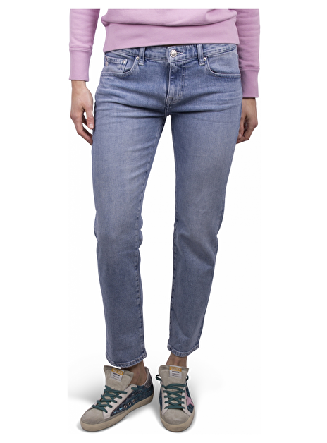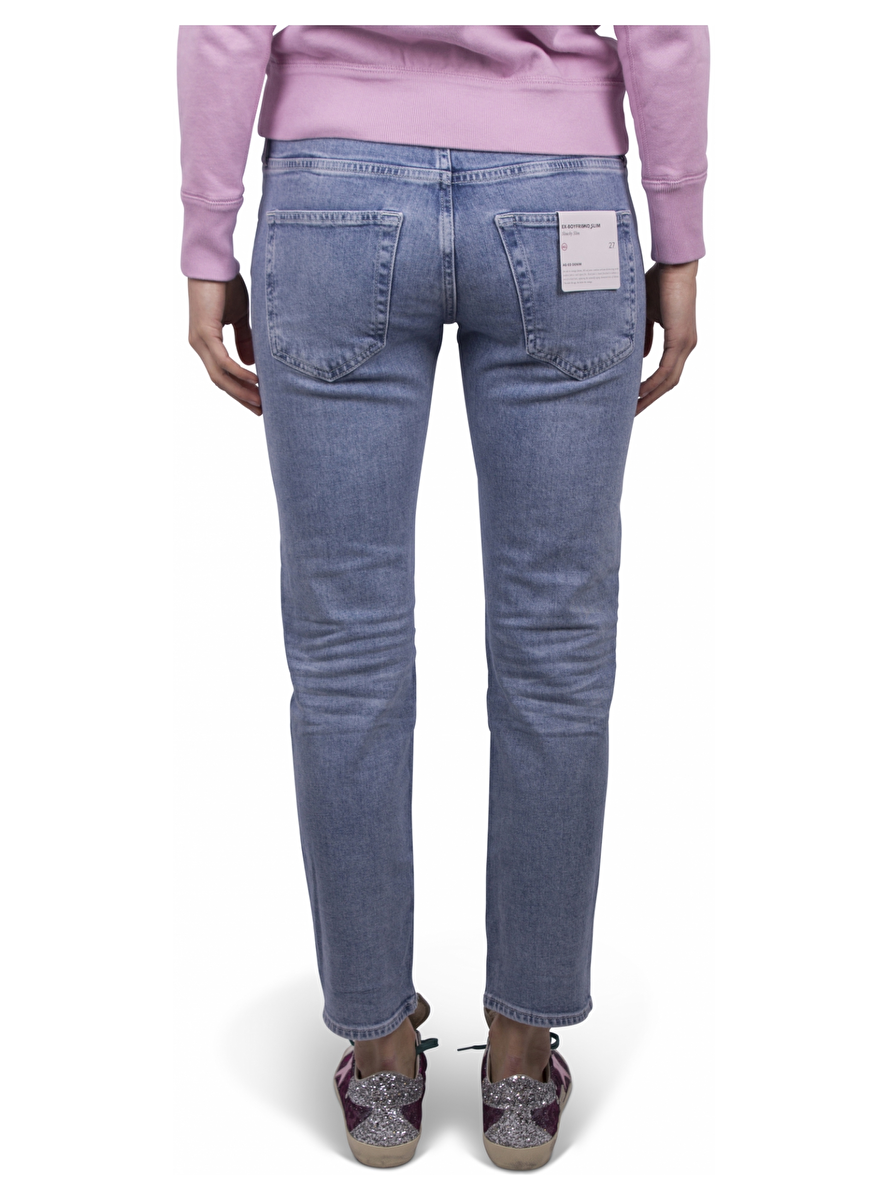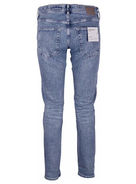 Jeans five pocket ex boyfriend slim blauw. Zilverkleurige details. Nude leder patch achterkant taille.