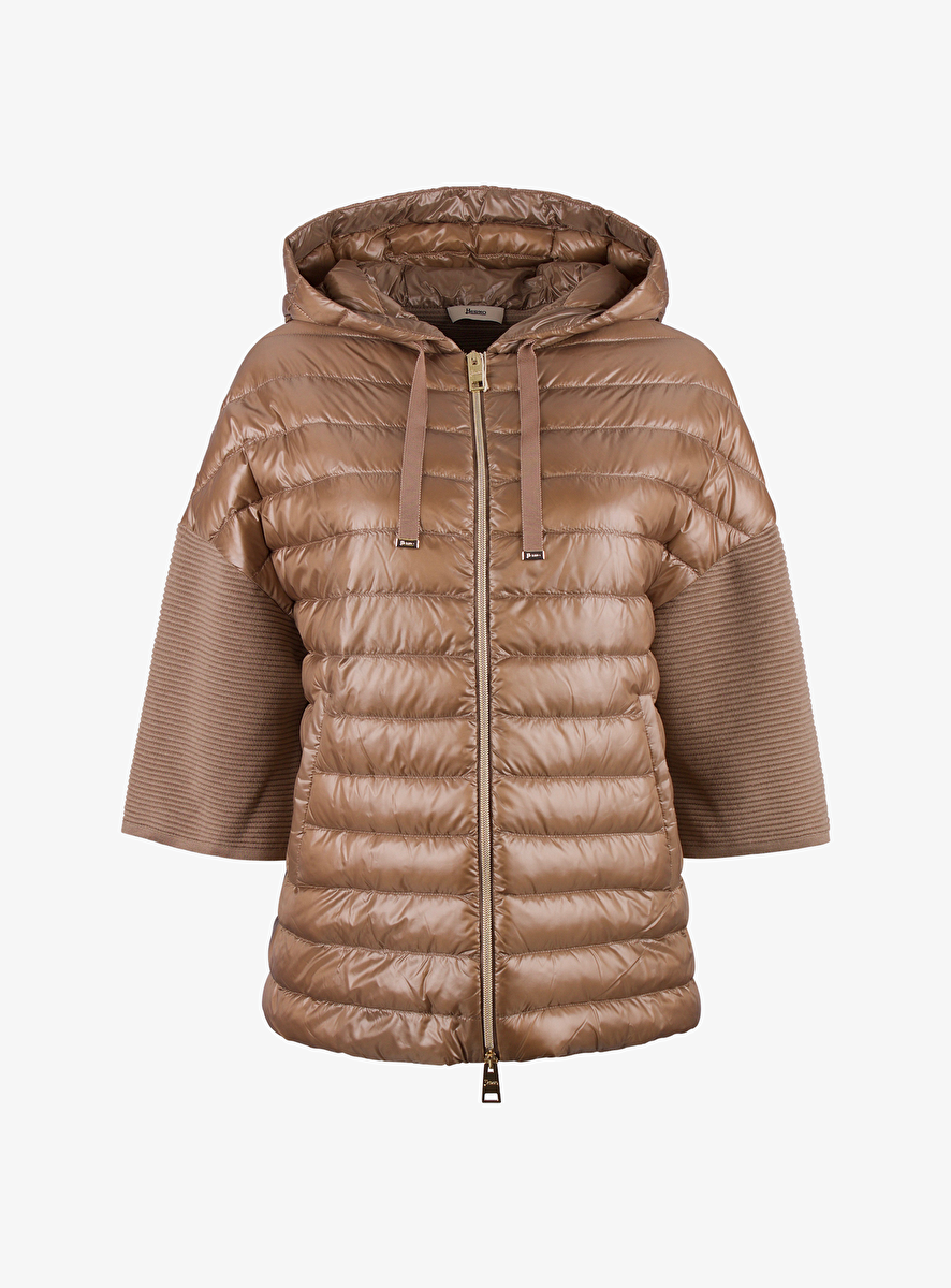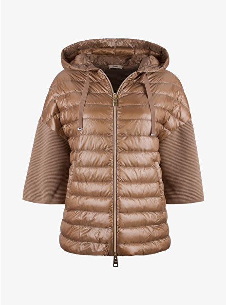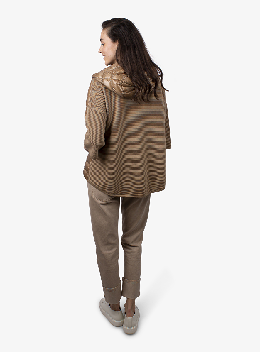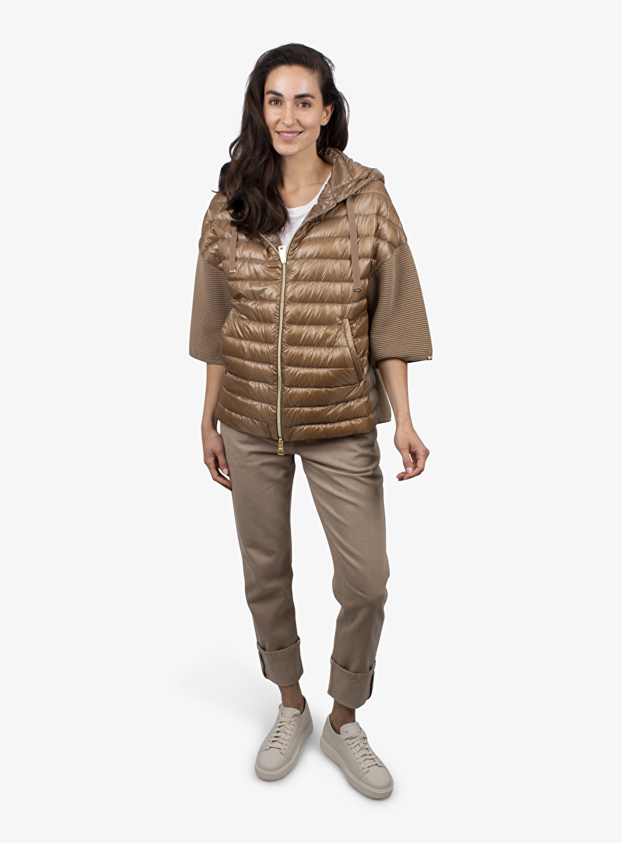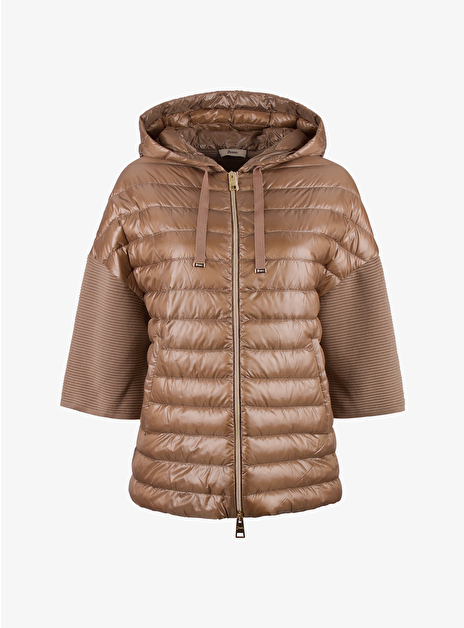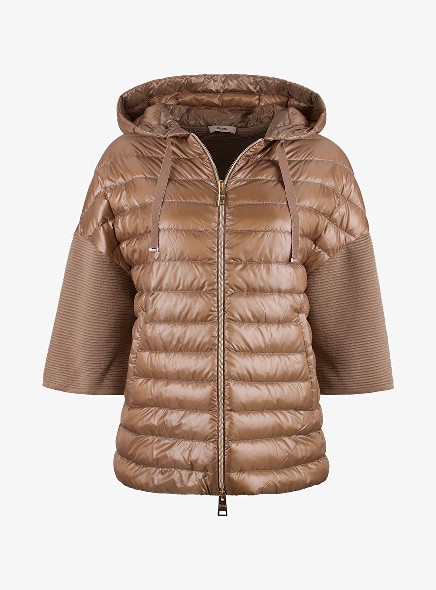 Deze jas heeft een glanzend camel gestepte voorkant met ribgebreide en goudkleurige details.