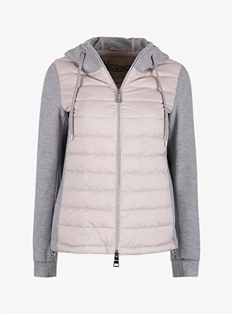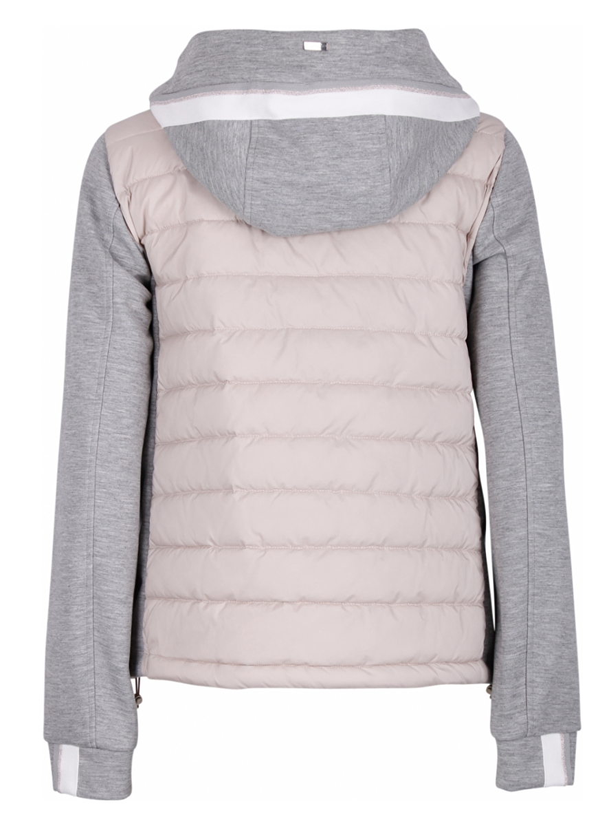 Jas gestept aan de voor en achterkant. Tricot capuchon en mouwen. Zakken. Elastisch koord in de zoom.