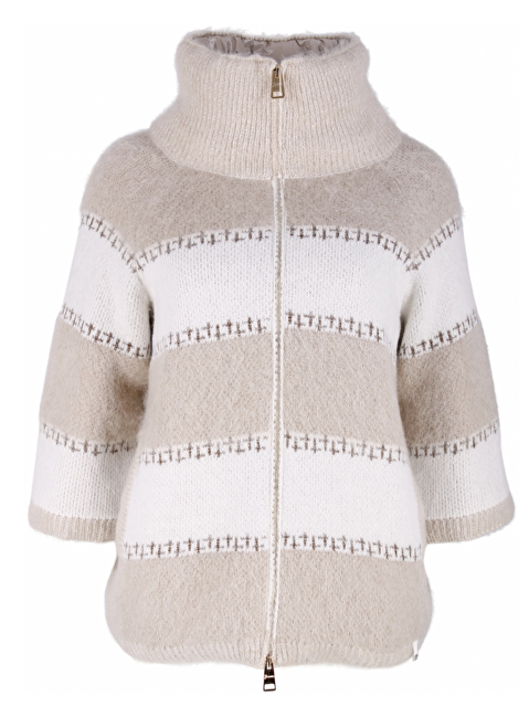 goudkleurig stiksel - brede strepen - hoge kraag - ritssluiting -steekzakken - goudkleurig merkje aan de achterkant.