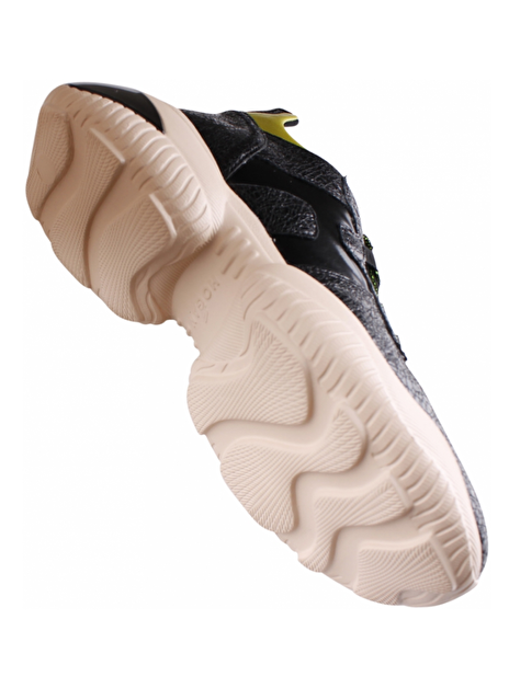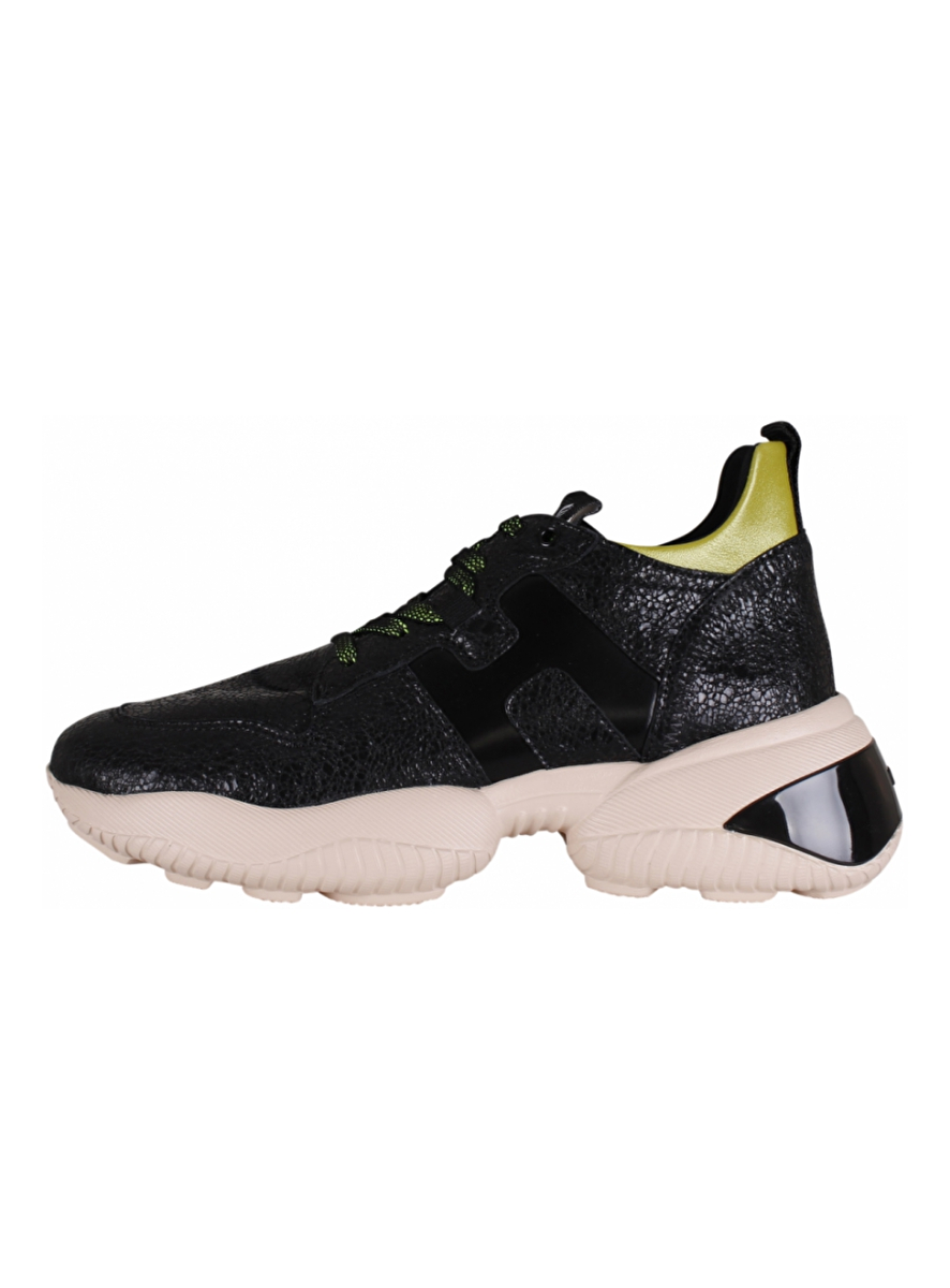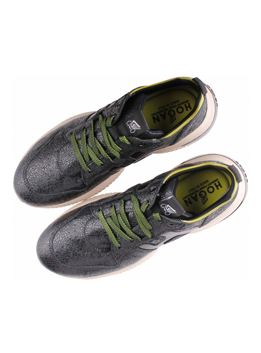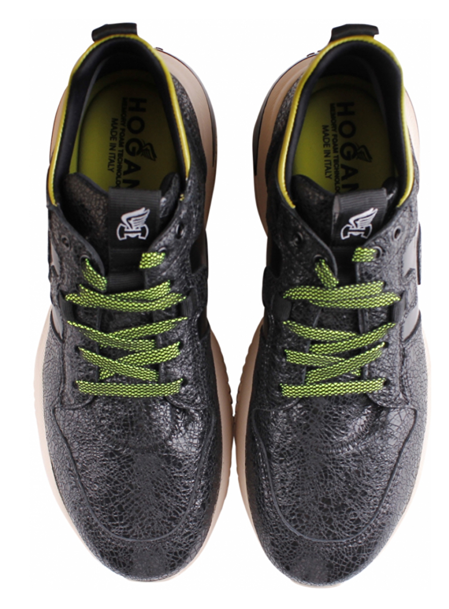 Zwarte sneaker interaction slip-on. craquele details. H in glans leder. Veters groen, zwart . De zool is nude rubber en heeft het merk Hogan gestanst in de lak hiel. De zool is licht oplopend en 5,5cm hoog. Hiel metallic groen. De binnenzool is uitneembaar memory foam.