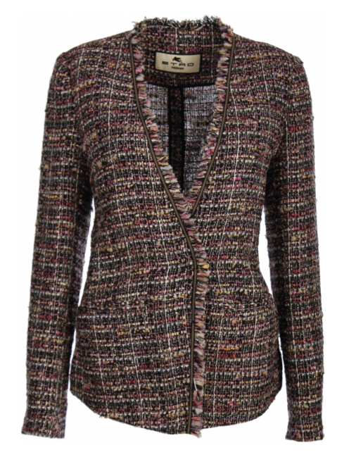 Blazer boucle in diverse paars en roze tinten gecombineerd met zwart en een vleugje beige en wit. De blazer heeft een lange mouw en een asymetrische sluiting met een drukker. Deze blazer is zeer draagbaar en mede door de kleurencombinatie zeer goed te combineren. Het materiaal bestaat uit 41% wol, 25% polyamide, 15% acryl, 9% katoen, 6% polyester en 4% viscose.