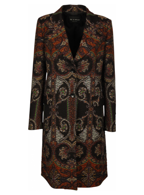 Lange blazer met reverkraag in een prachtig dessin van verschillende tinten zoals: zwart, terra, groen, lila, geel enz. Het materiaal is 79% polyester, 15% viscose en 6% acryl.