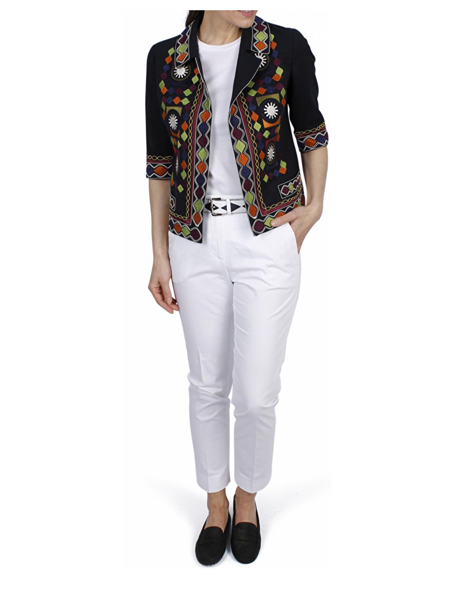 Marine blazer met diverse kleuren zoals: terracotta, blauw, offwhite, paars en geel. De jas valt kort en heeft een mooi etnisch borduurwerk 'All over'. De mouwen zijn driekwart. Het jasje valt open en is aan de binnenkant helemaal afgewerkt met een paisleyprint. Etro mooi!
