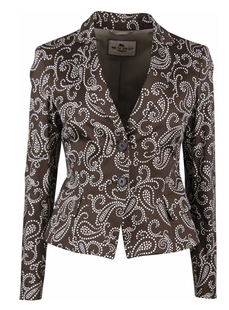 Korte gevoerde blazer in olijfgroen met offwhite paisley dot print allover. Deze sluit met twee knopen, heeft een schuine snit met klepzakken. De achterkant heeft een peplum schootje.