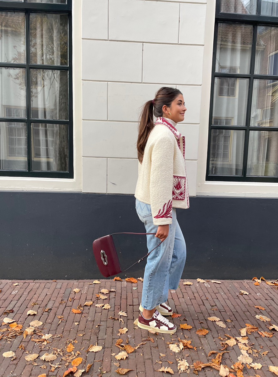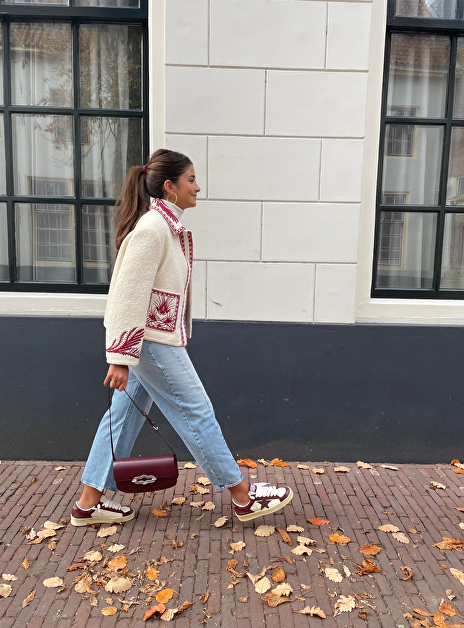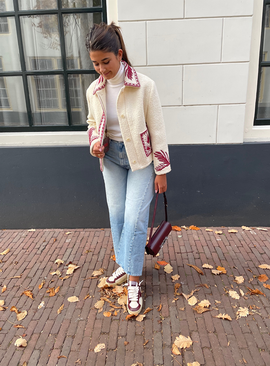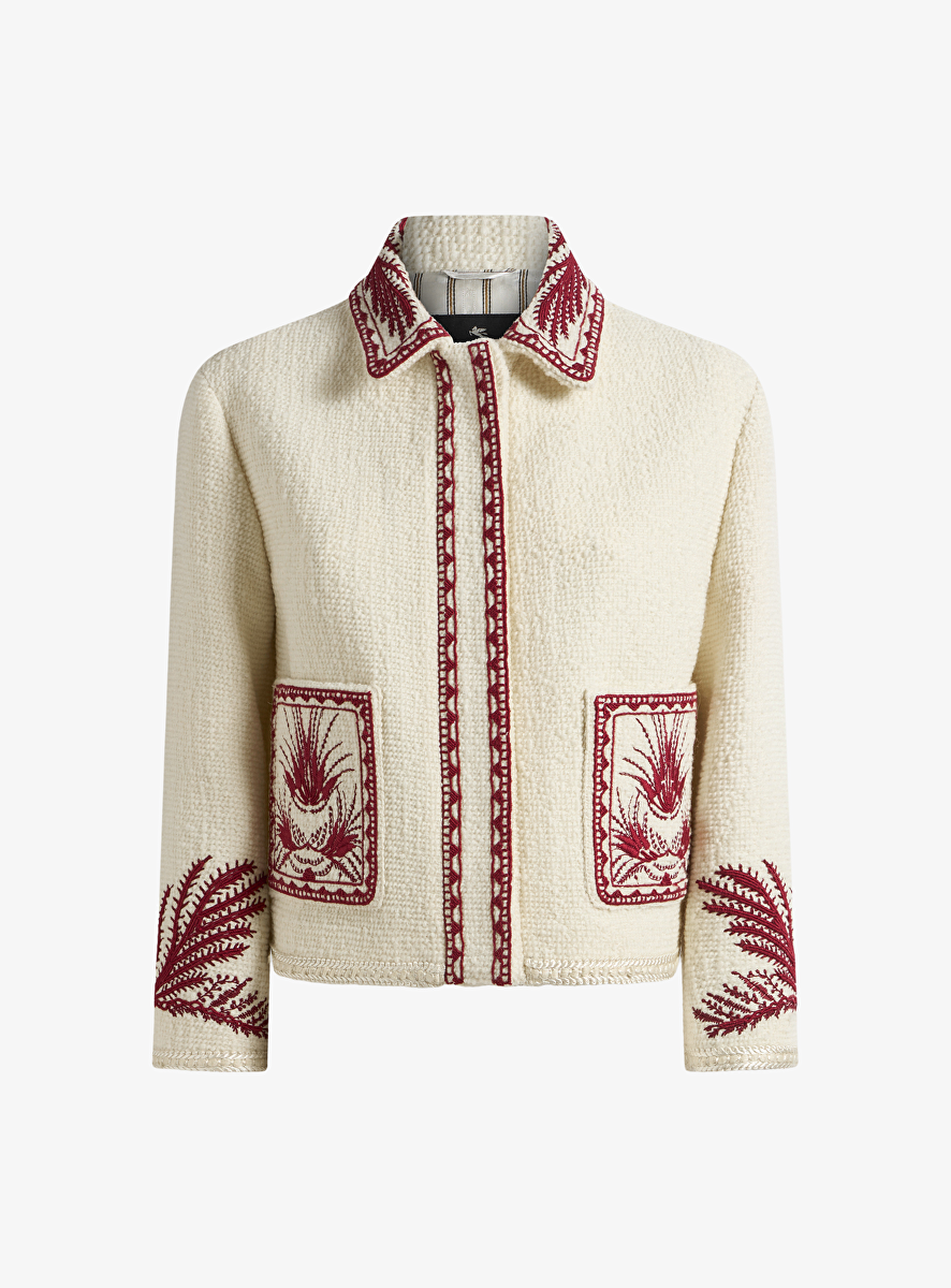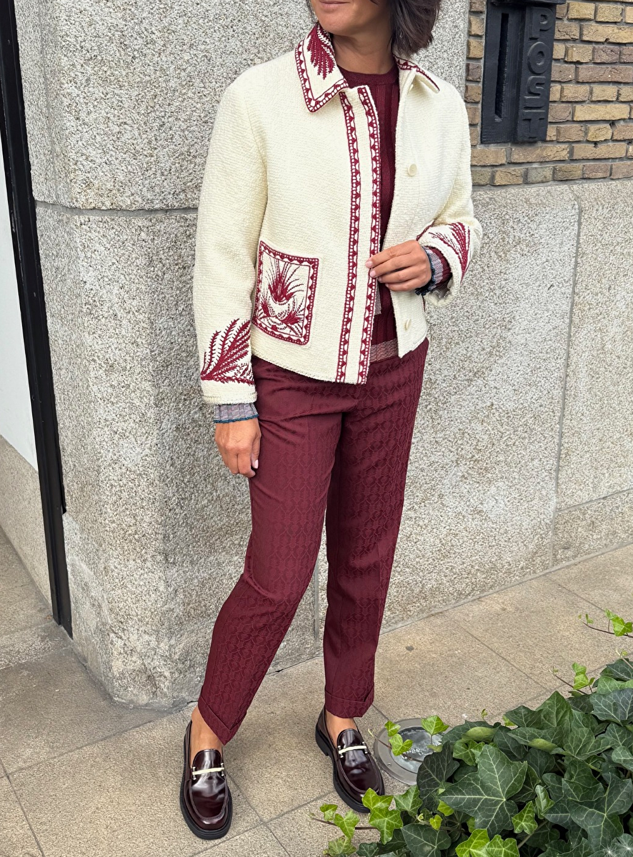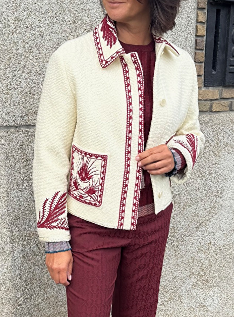 geometrisch bladmotief geborduurd op de kraag, knoopsluiting, mouwuiteinden en zakken