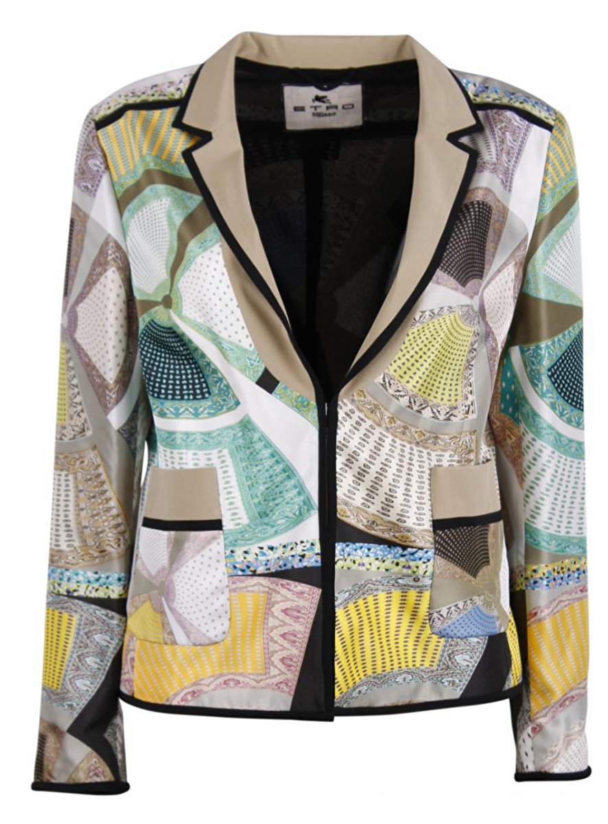 Zijde blazer in groen abstracte print met zakken en een taupe rever. Deze is afgewerkt met een zwarte bies die ook terugkomt aan de manchetten en onderkant zoom.