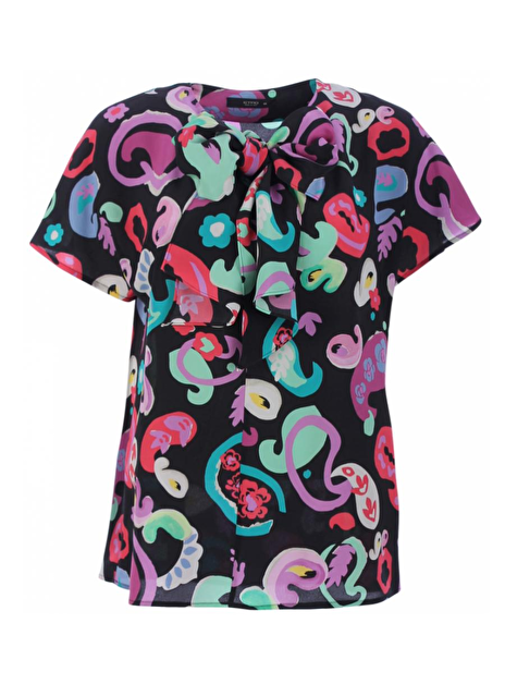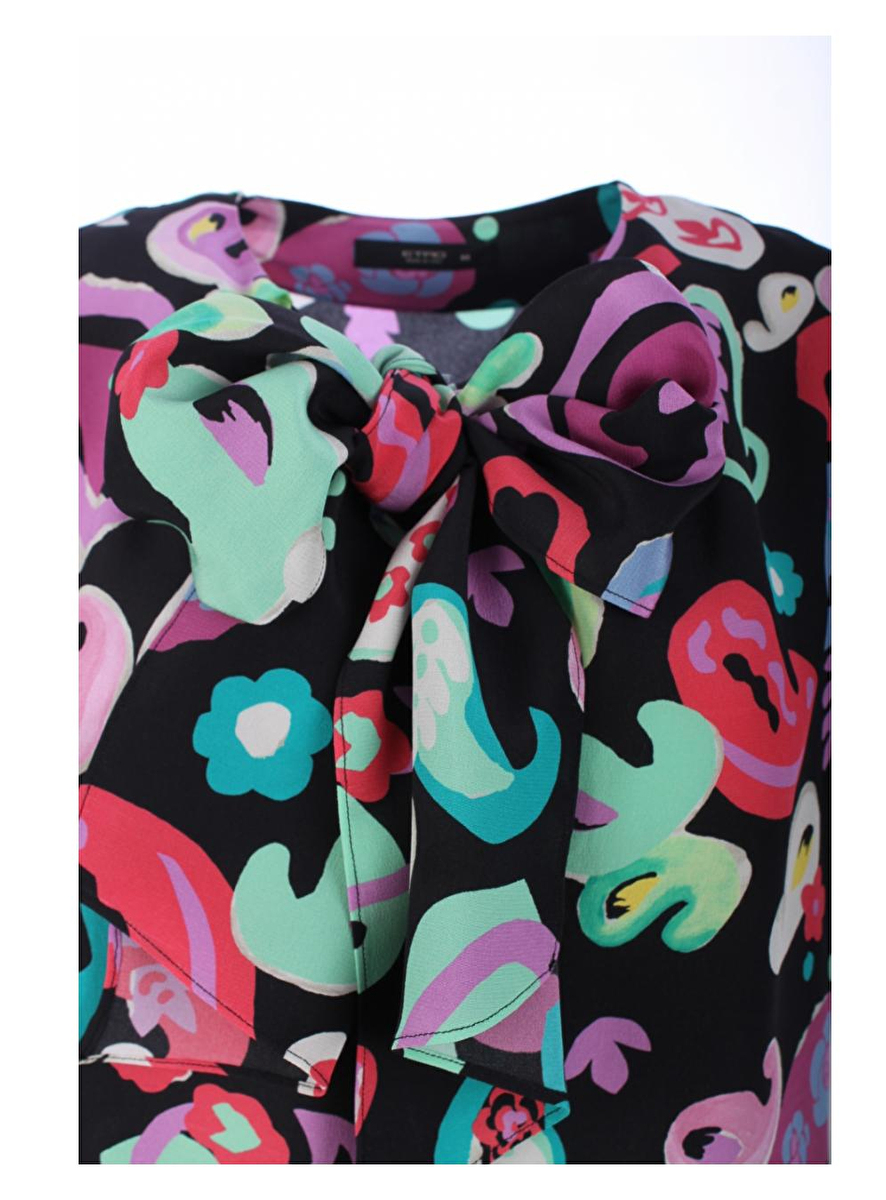 Het bekende paisley dessin van Etro uitgevoerd in diverse groen, paars en roze tinten die goed naar voren komen door de zwarte achtergrond. Het betreft een losvallende zijde top met korte mouw en ronde hals die uitloopt in een V-hals. Leuk detail is de strikkraag die op verschillende manieren gedragen kan worden. Het materiaal bestaat uit 100% zijde.