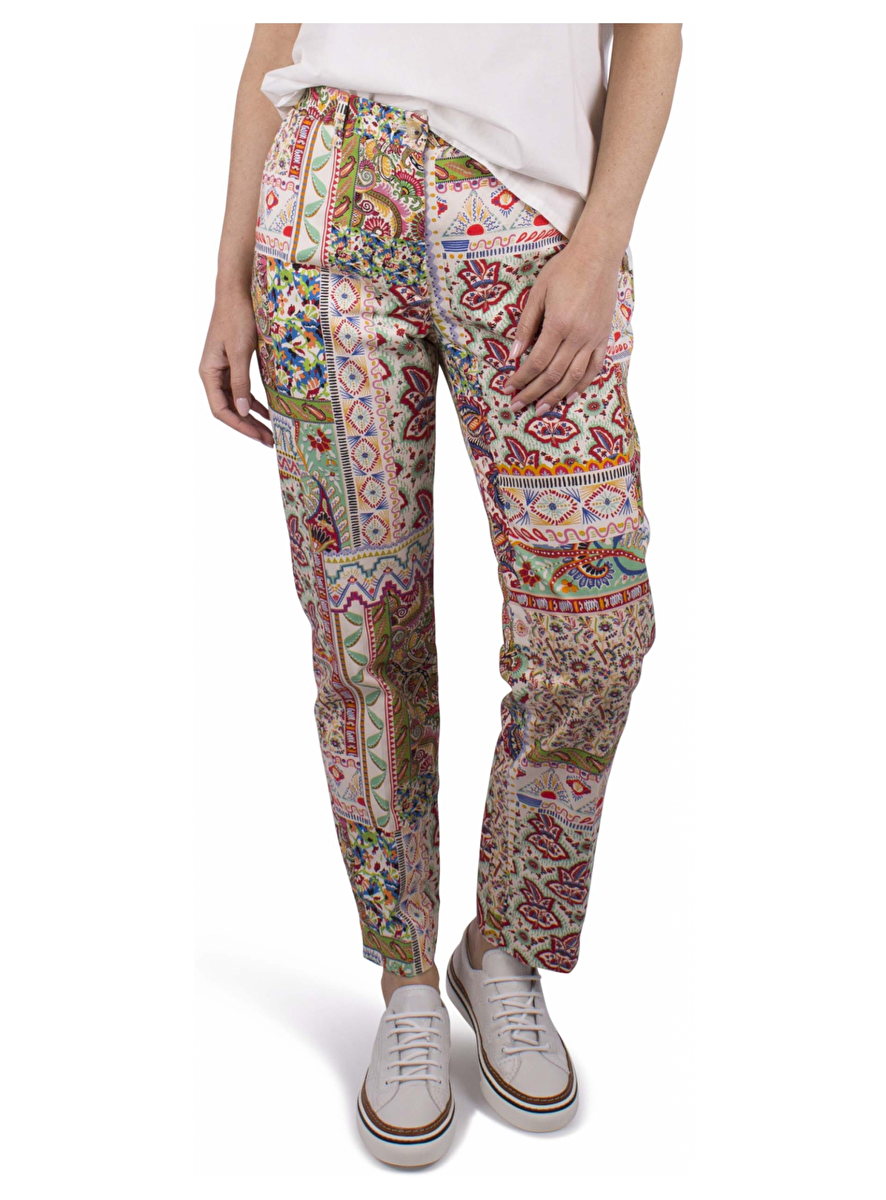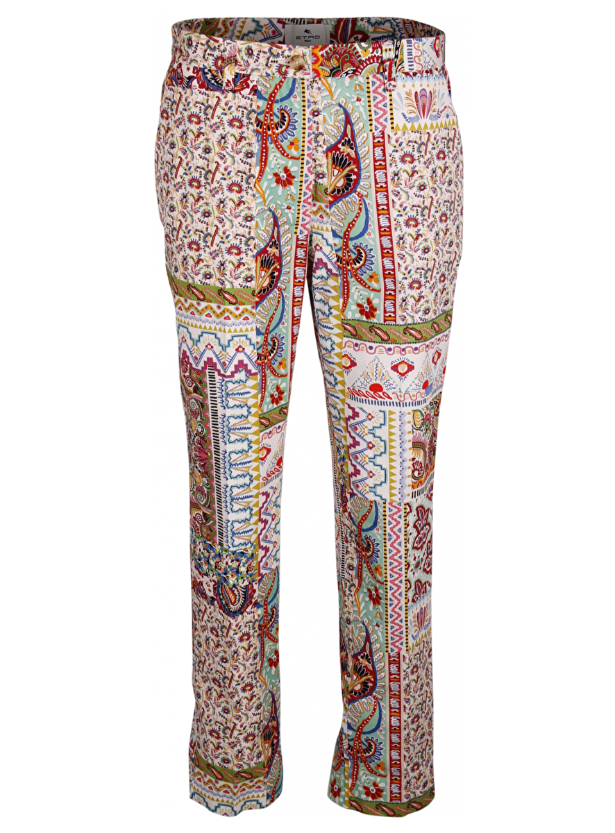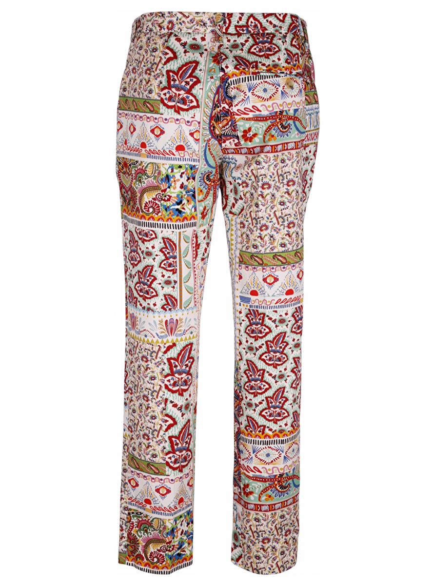 Pantalon in paisley print allover multicolor. Steekzakken. Persvouw. 1 Zak aan de achterkant.