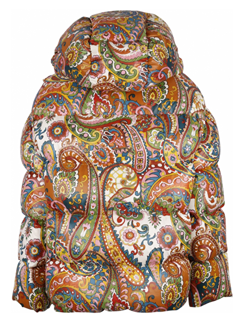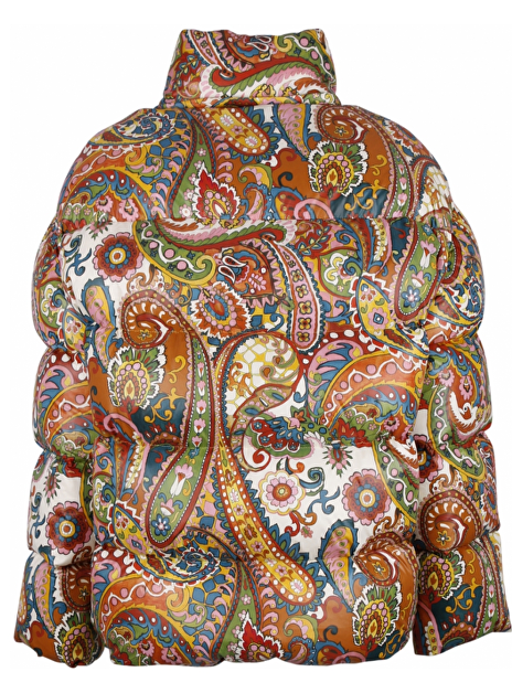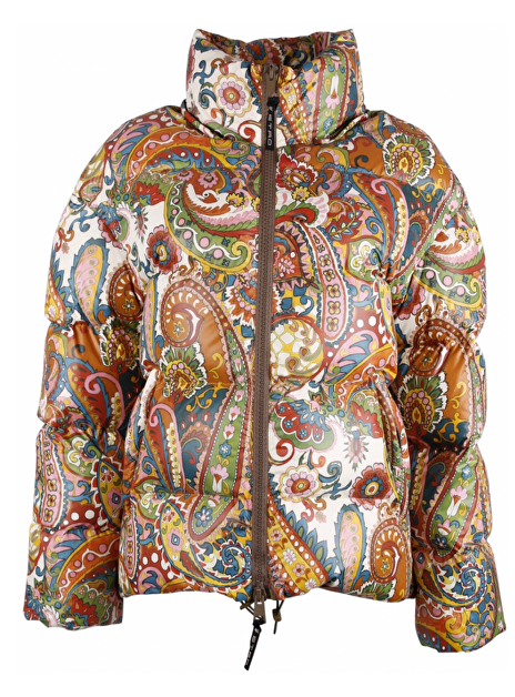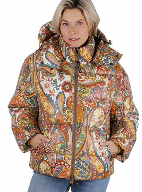 Jack/puffer met multicolor paisley dessin. Afritsbare capuchon. Sneeuwstopper. Elastische manchetten.