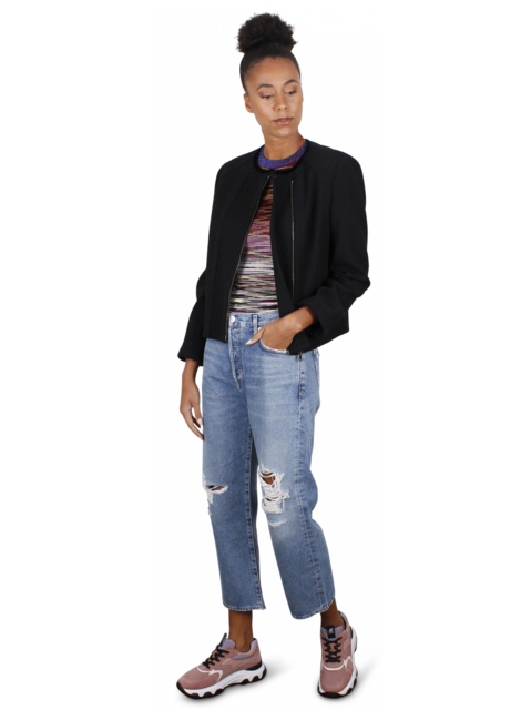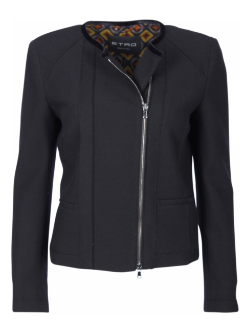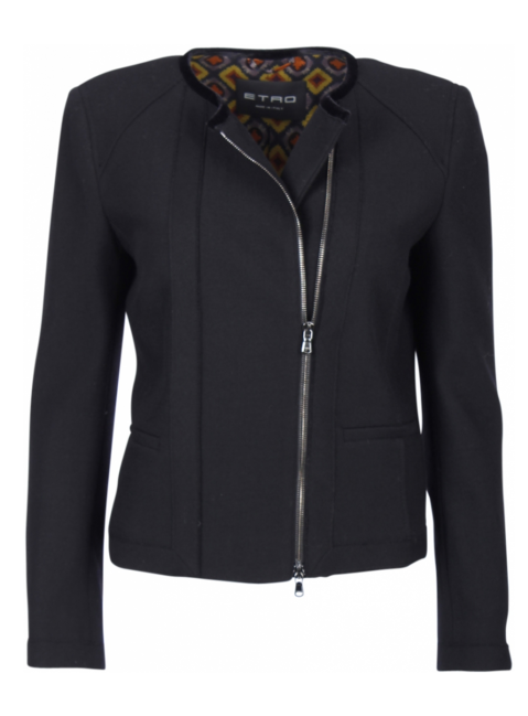 jasje kort zwart met rits in 77% wol, 19% polyamide en 4% elasthan. Het jasje is in een 'biker'model met een asymmetrische rits. Langs de ronde hals is een bies in zwart velours. Het bereft een rechtvallend model.