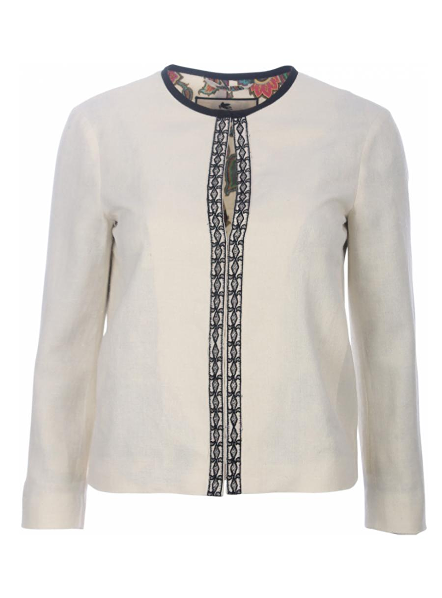 Jasje kort met zwarte bies en lange mouw. Het jasje heeft een prachtige voering met ingeweven bloemen en paisley dessin, Het materiaal aan de buitenzijde bestaat uit wilde zijde waardoor het weefsel niet helemaal perfect is en er een nonchalant effect ontstaat met een luxe uitstraling. Dit heeft ook zeker te maken met het boxing model. De bies in het midden heeft een mooi zwart wit borduursel en sluit met een haakje bij de hals. Het materiaal bestaat uit 100% zijde.